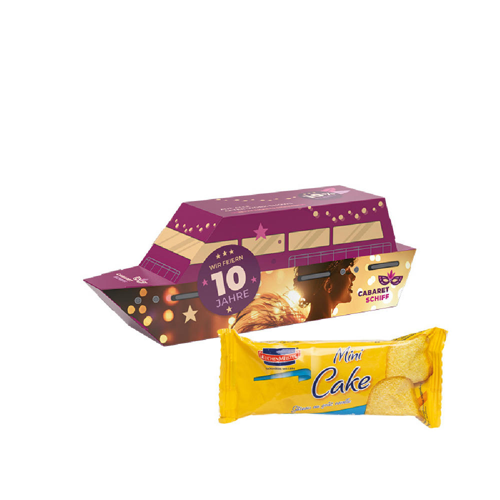 Schiff Verpackung aus weißem Karton, individuell bedruckt. Inhalt: 1 Tütchen Lorenz Nic Nac‘s Erdnüssen im Teigmantel, 35 g,