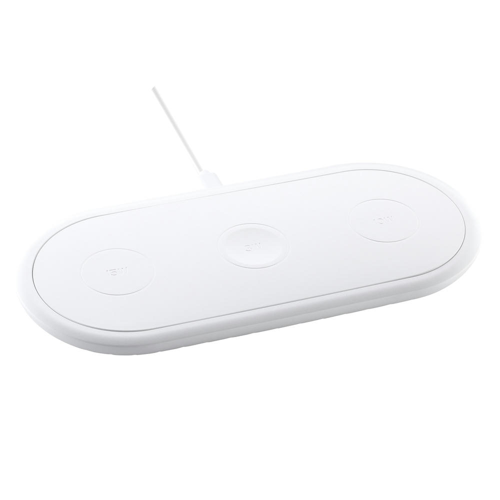 Er hat drei Charging-Flächen mit unterschiedlichen Leistungen. Eine Fläche mit max. 15 Watt, eine mit max. 10 Watt Ausgangsleistung und mittig eine magnetische 3 Watt-Ladefläche für die Smartwatch des Herstellers Apple®. Ab einer Ladeleistung von 5 Watt leuchten die LEDS auf der Unterseite des Chargers blau (indirektes Licht).
