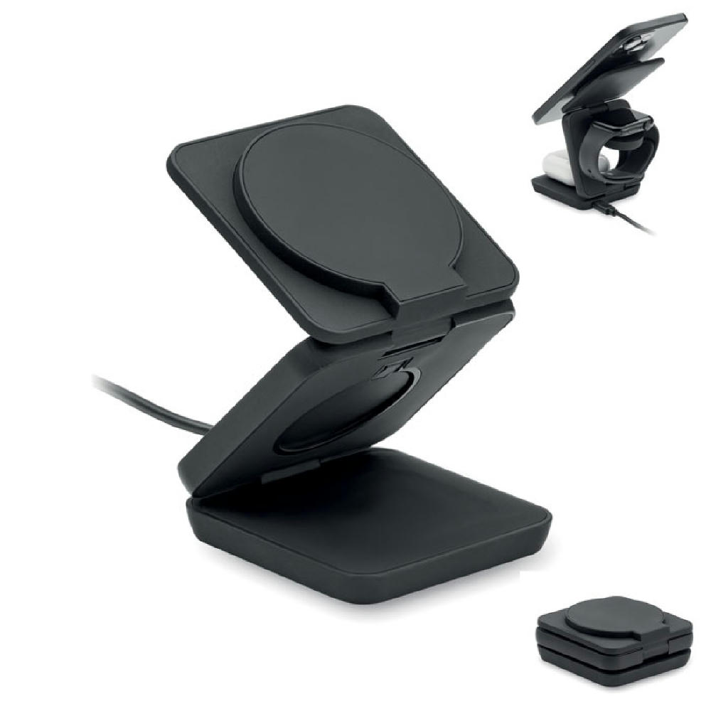 3in1 faltbare Ladestation. Gummiertes, recyceltes ABS. Inkl. kabelloses Ladegerät 15 W, Smartwatch-Ladegerät (nur Apple®) sowie TWS-Ladegerät.