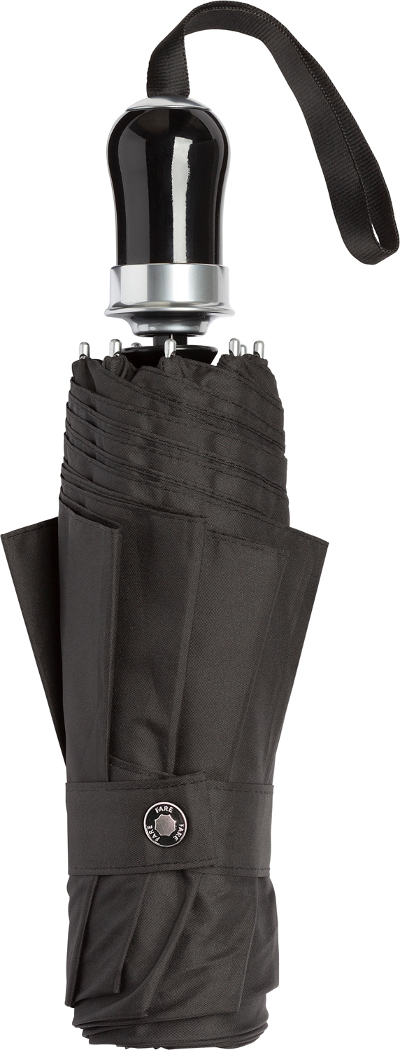 Schicker Taschenschirm mit neuartigem Öffnungs- und Schließmechanismus. Komfortable Doppelautomatik-Funktion zum schnellen Öffnen und Schließen durch Herunterziehen des Rings, hochwertiges Windproof-System für eine maximale Gestell-Flexibilität bei stärkeren Windböen, wassersparend gefärbtes Polyester-Pongee waterSAVE® Bezugsmaterial aus recycelten Kunststoffen, mit waterSAVE®-Label auf dem Schließband, silberne Nickelspitzen, Griff hochglänzend schwarz mit verchromten Applikationen und gewebter Trageschlaufe, Schließband und Futteral mit edlem Druckknopf.
