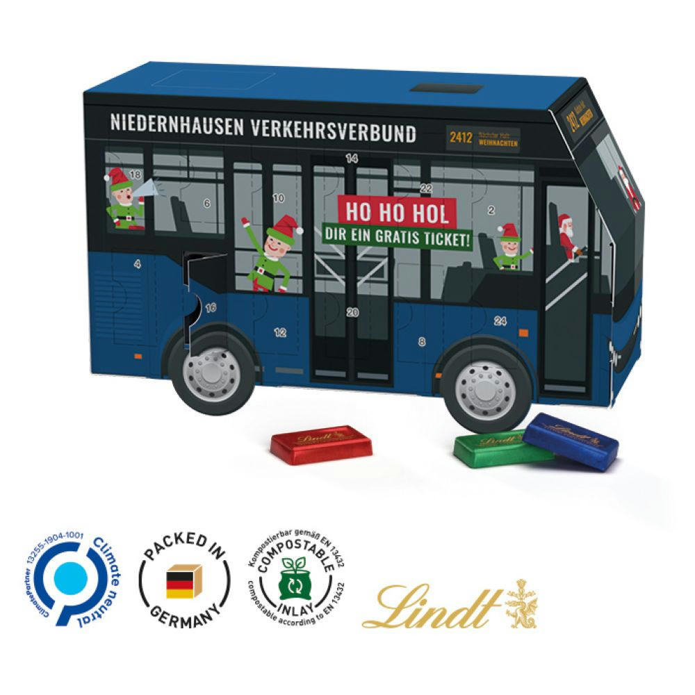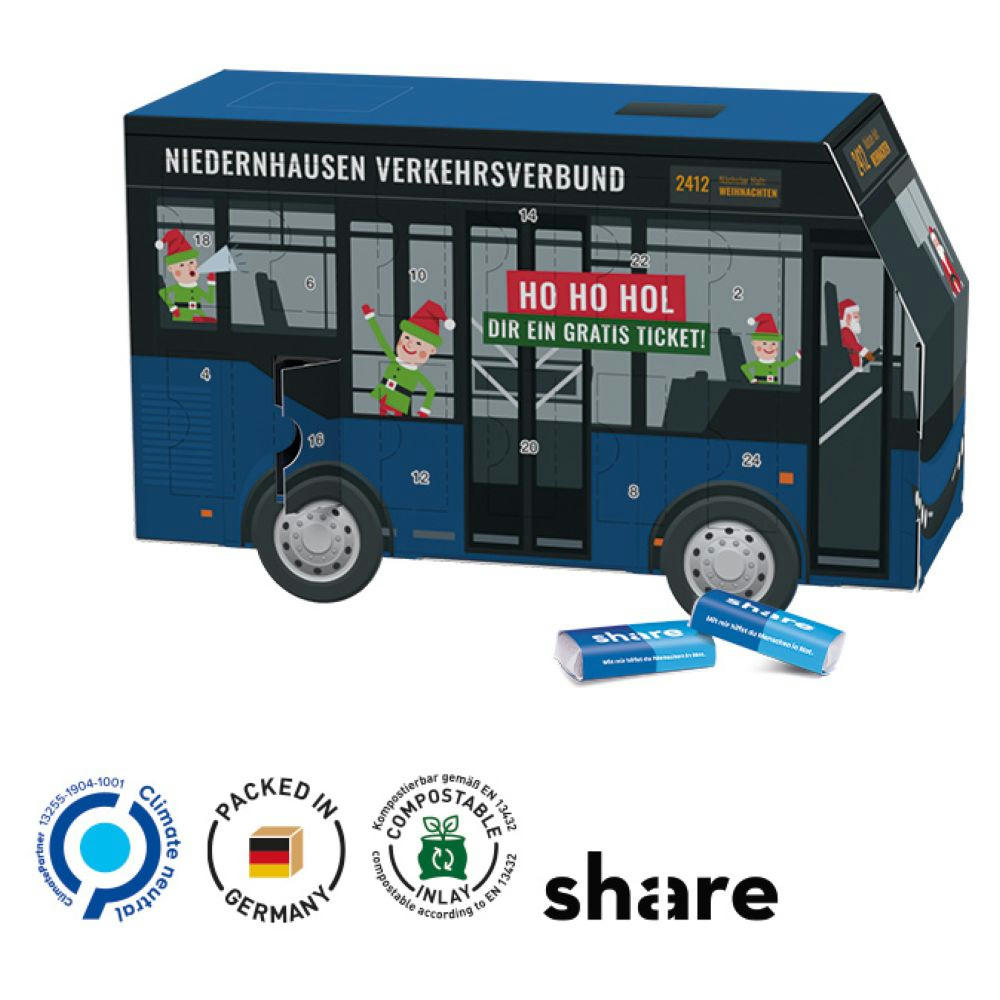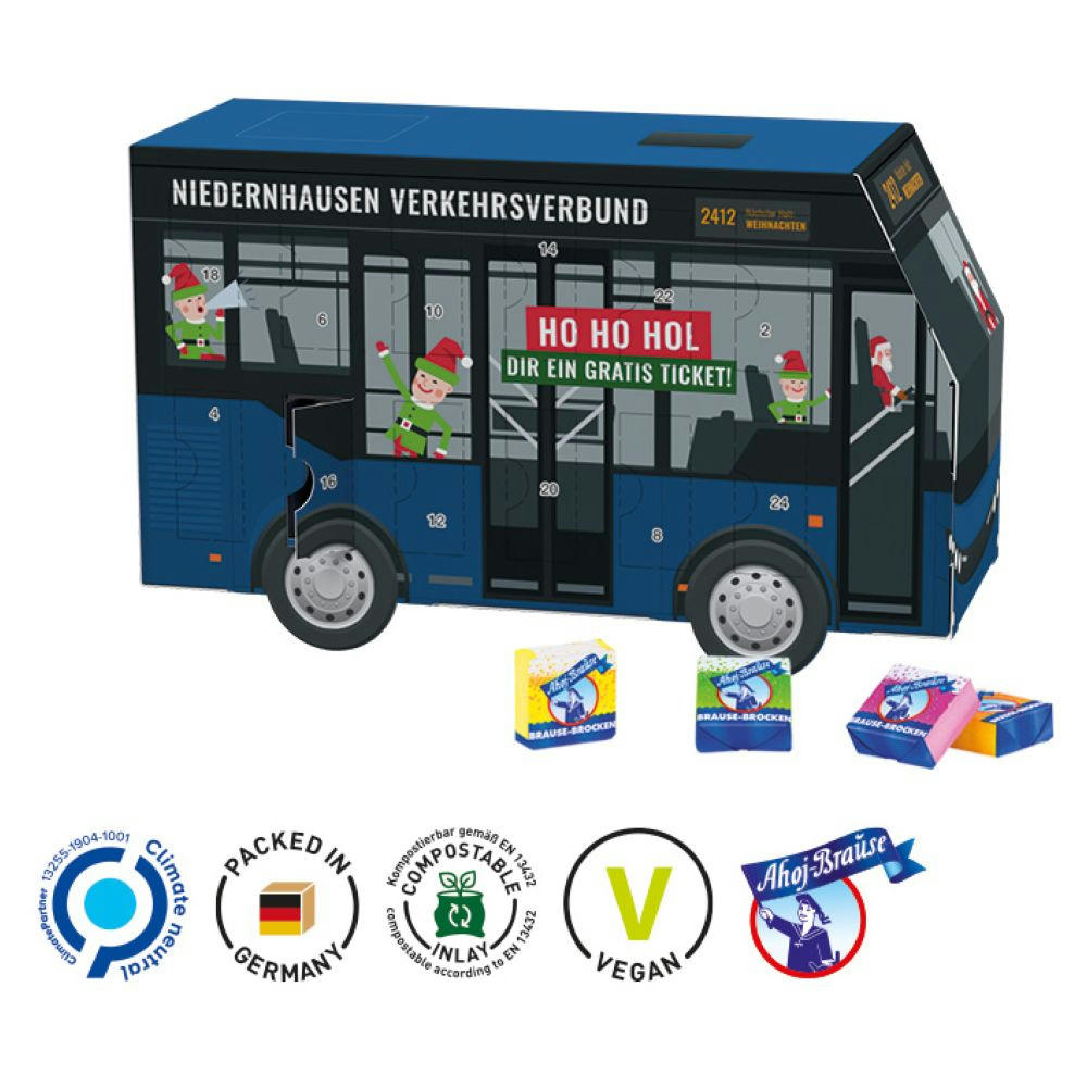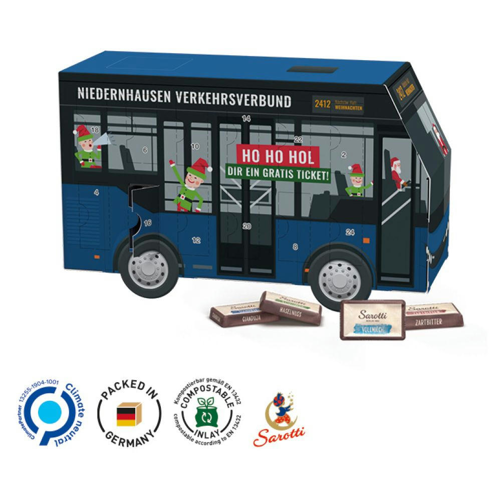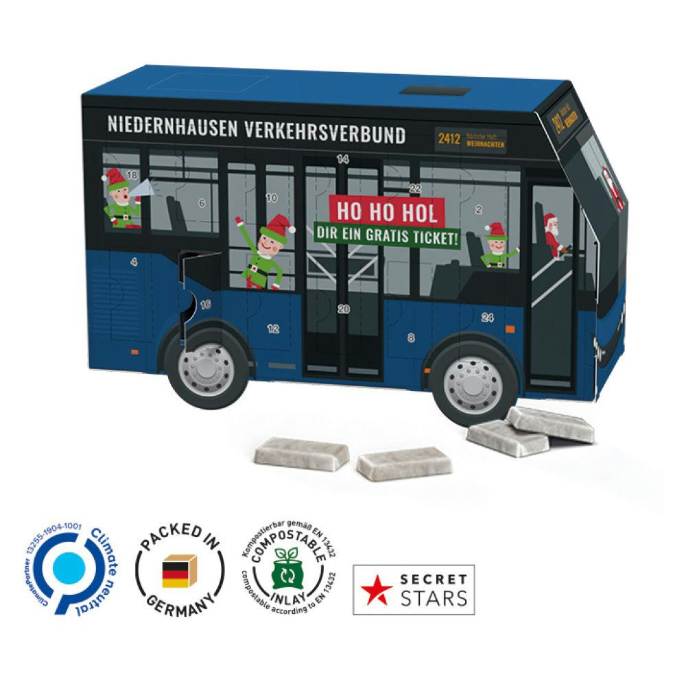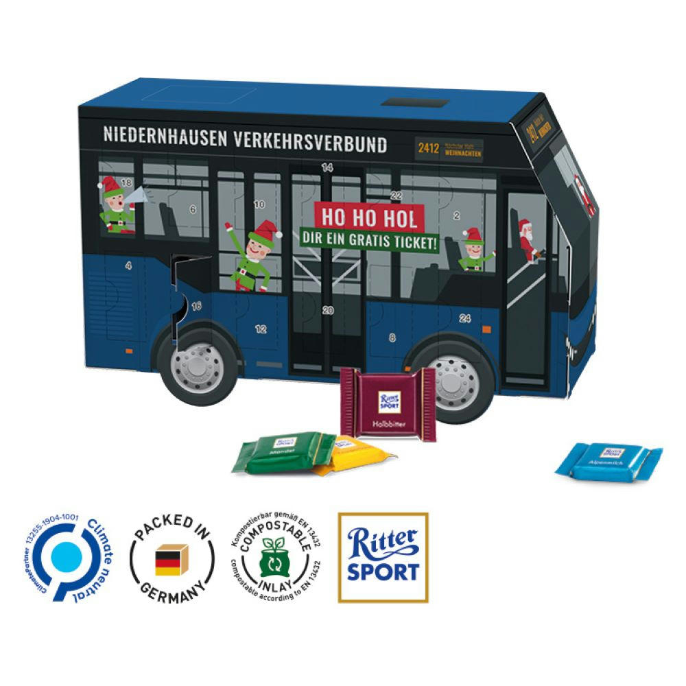 Adventskalender Bus in Vollkartonhülle mit kompostierbarem Inlay, rundum individuell bedruckt. Inhalt: 24 Ritter SPORT Schokowürfel, variierende Mischung aus den Sorten : Schoko Crisp, Mousse au Chocolat, Vollnuss in Nugatcreme, Karamell Duo, 192 g. Saisonartikel - solange der Vorrat reicht! Auf Anfrage und gegen Aufpreis: Verpackt in versandgeeignetem Einzelkarton