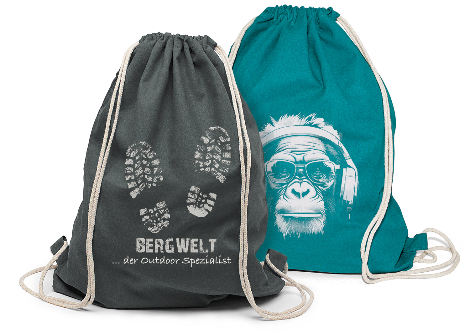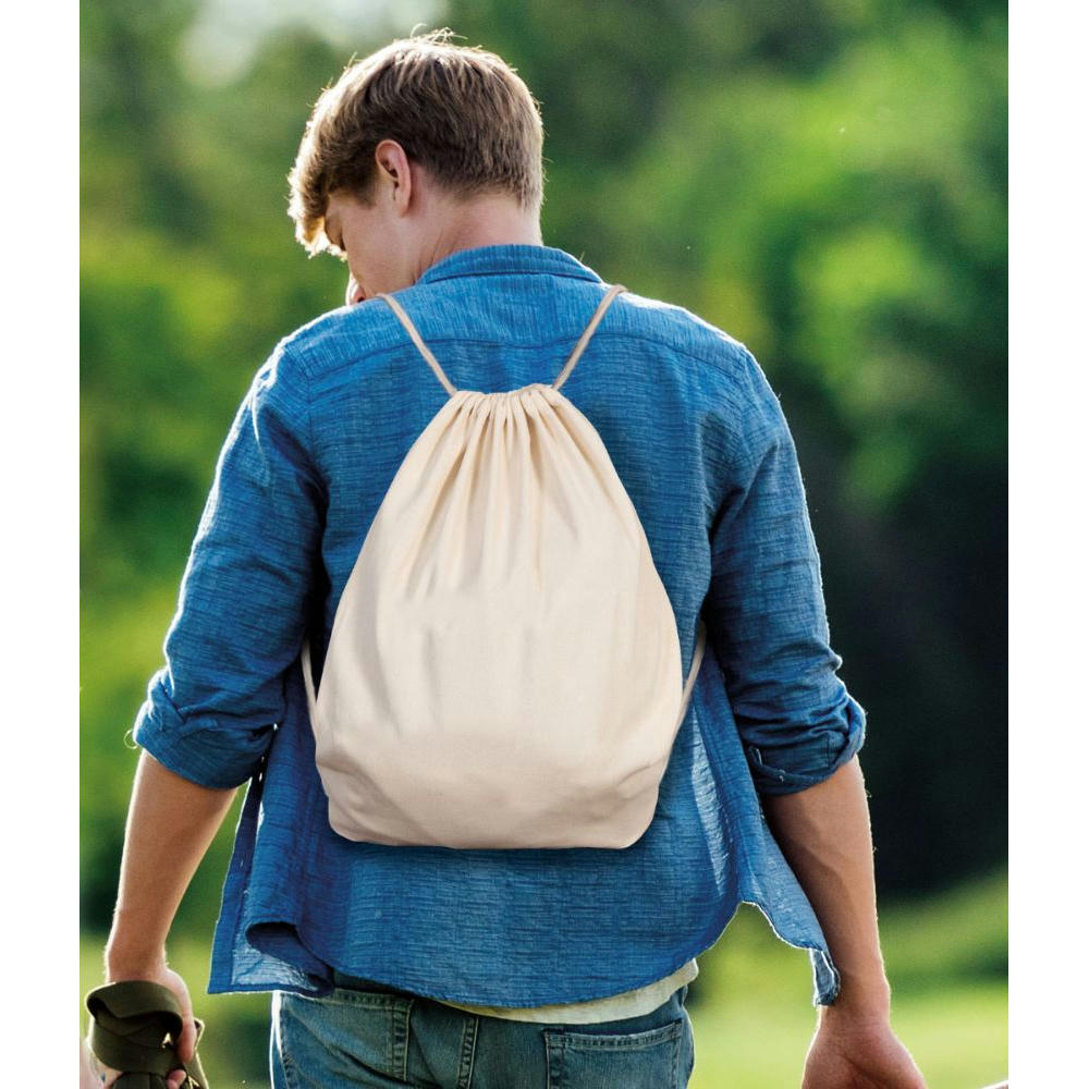 Rucksack/Turnbeutel aus OEKO-TEX® zertifizierter Baumwolle, mit Bodenfalte und Kordelzug.