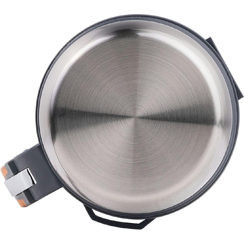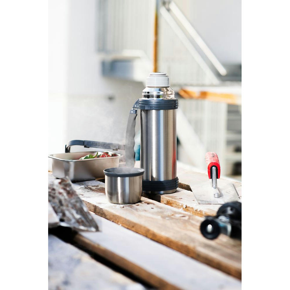 Vakuumflasche mit Schraubdeckel als Trinkbecher und stabilem Klappgriff.