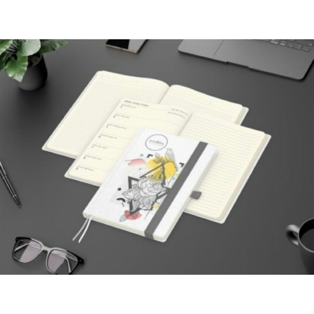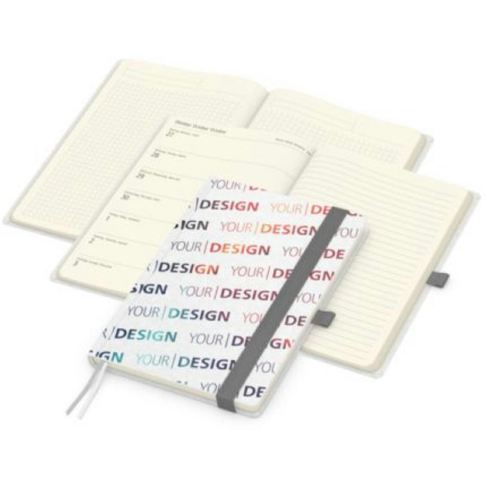 Der Hybrid-Timer für jedes Corporate Design mit cremefarbenem Inhaltspapier. Individuell bedruckter Einband kombiniert mit Gummiband und Stiftschlaufe in Wunschfarbe. Wochenkalendarium von August 2024 - Dezember 2025