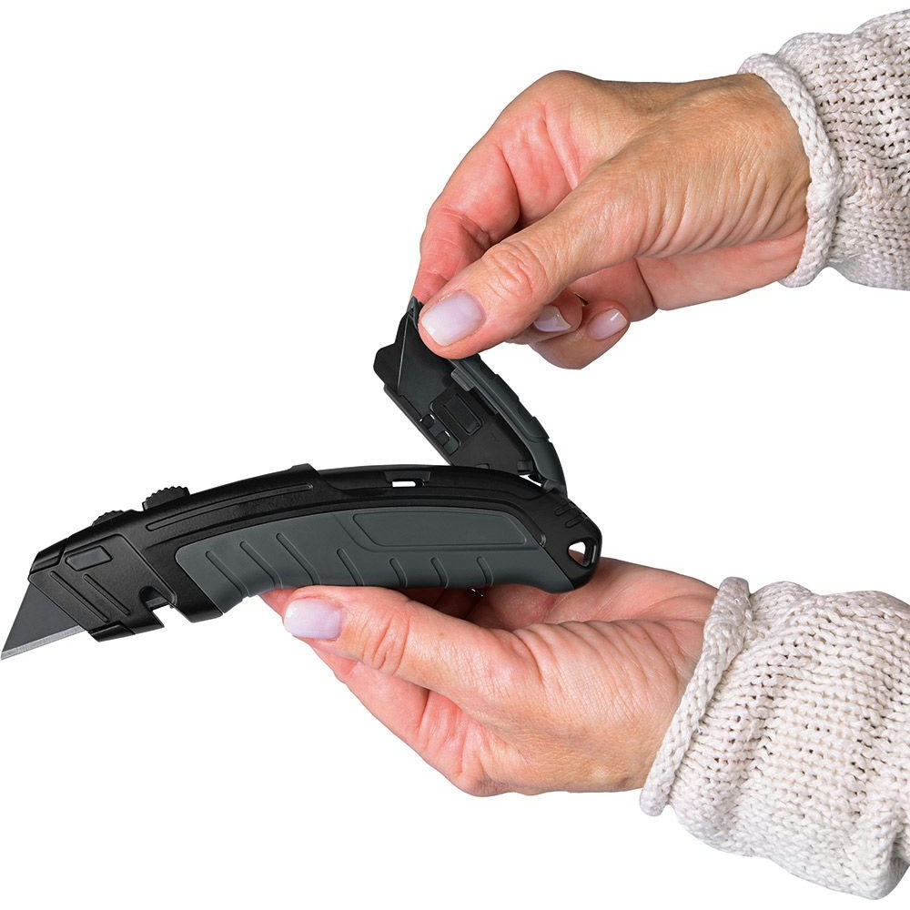 Universal-Trapezklingenmesser mit SK2 Hochleistungsklingen. Hochwertiges Qualitäts-Cuttermesser mit Aluminiumgehäuse und 3-fach arretierbarem Klingenausschub. Für Rechts- und Linkshänder geeignet.