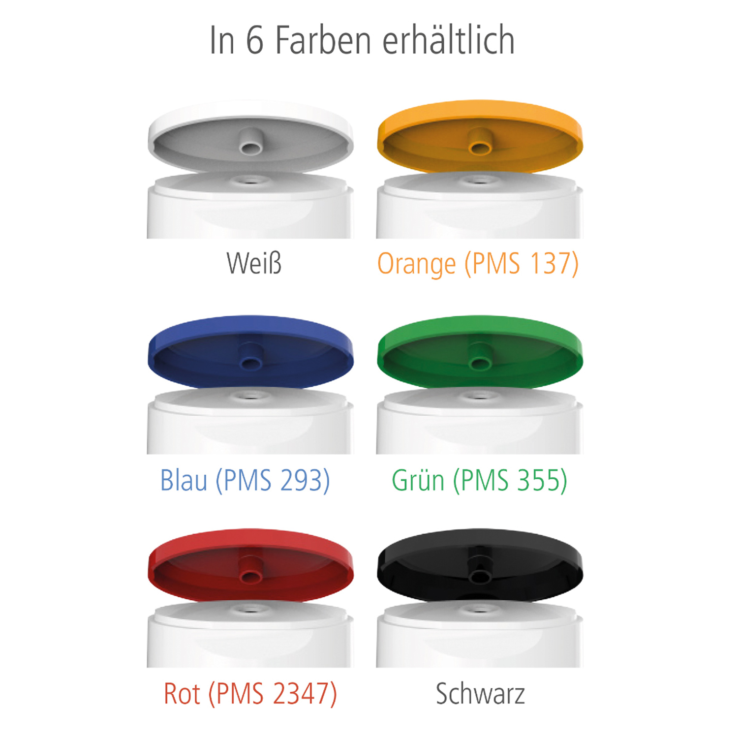 Werbeanbringung und Verpackung: * Klappdeckel oben und unten erhältlich in 6 wählbaren Farben: blau, orange, grün, rot, weiß oder schwarz. * Handliches Format: 5,4 x 2,6 x 14,9 cm * Etikett auf Vorder- und Rückseite der Flasche * Druck in 4c CMYK