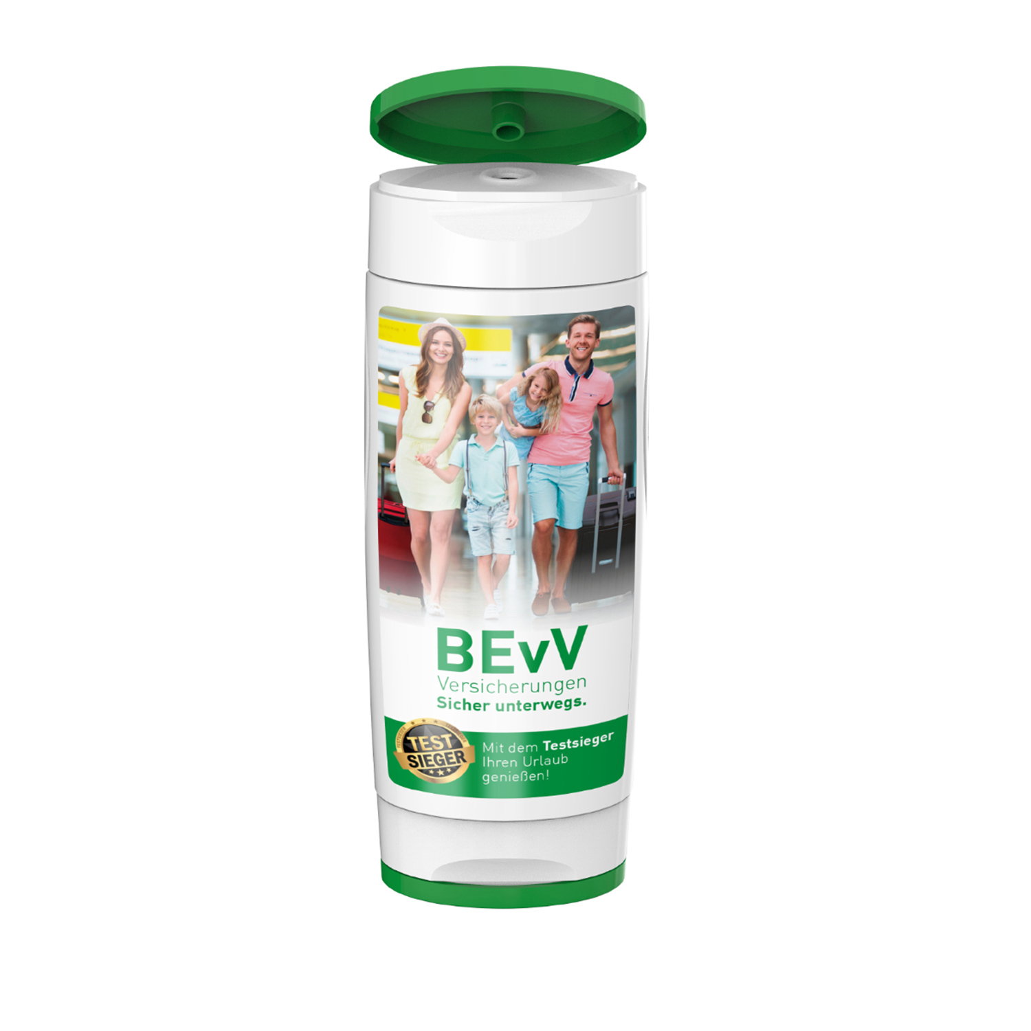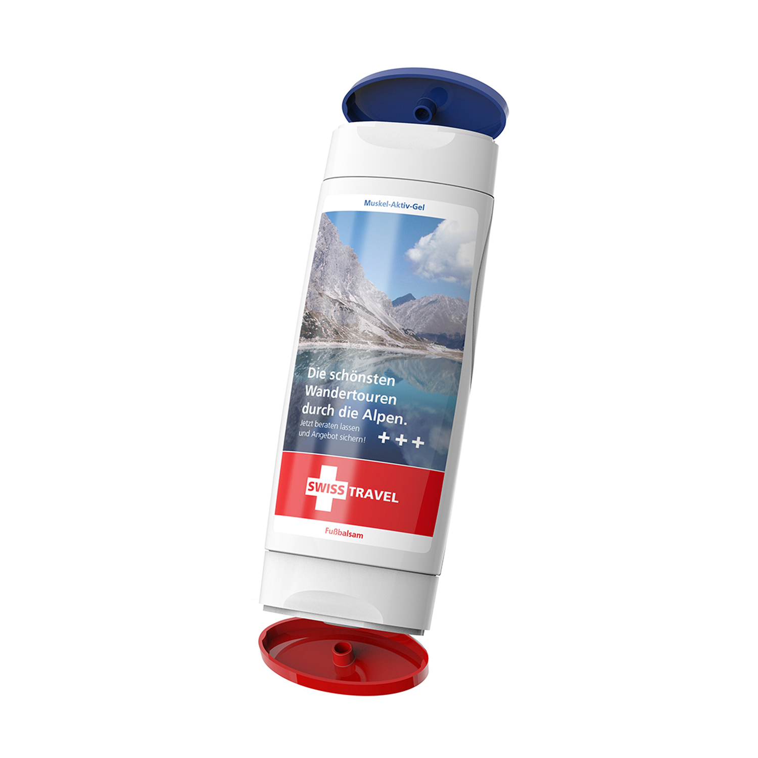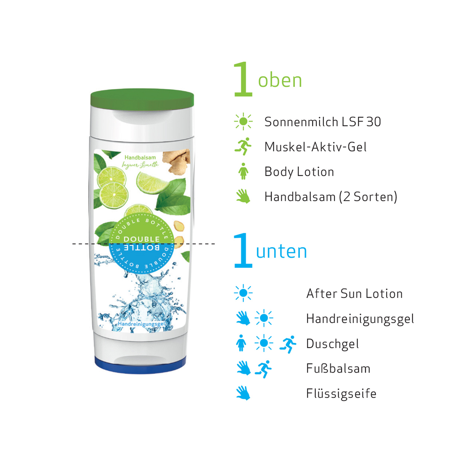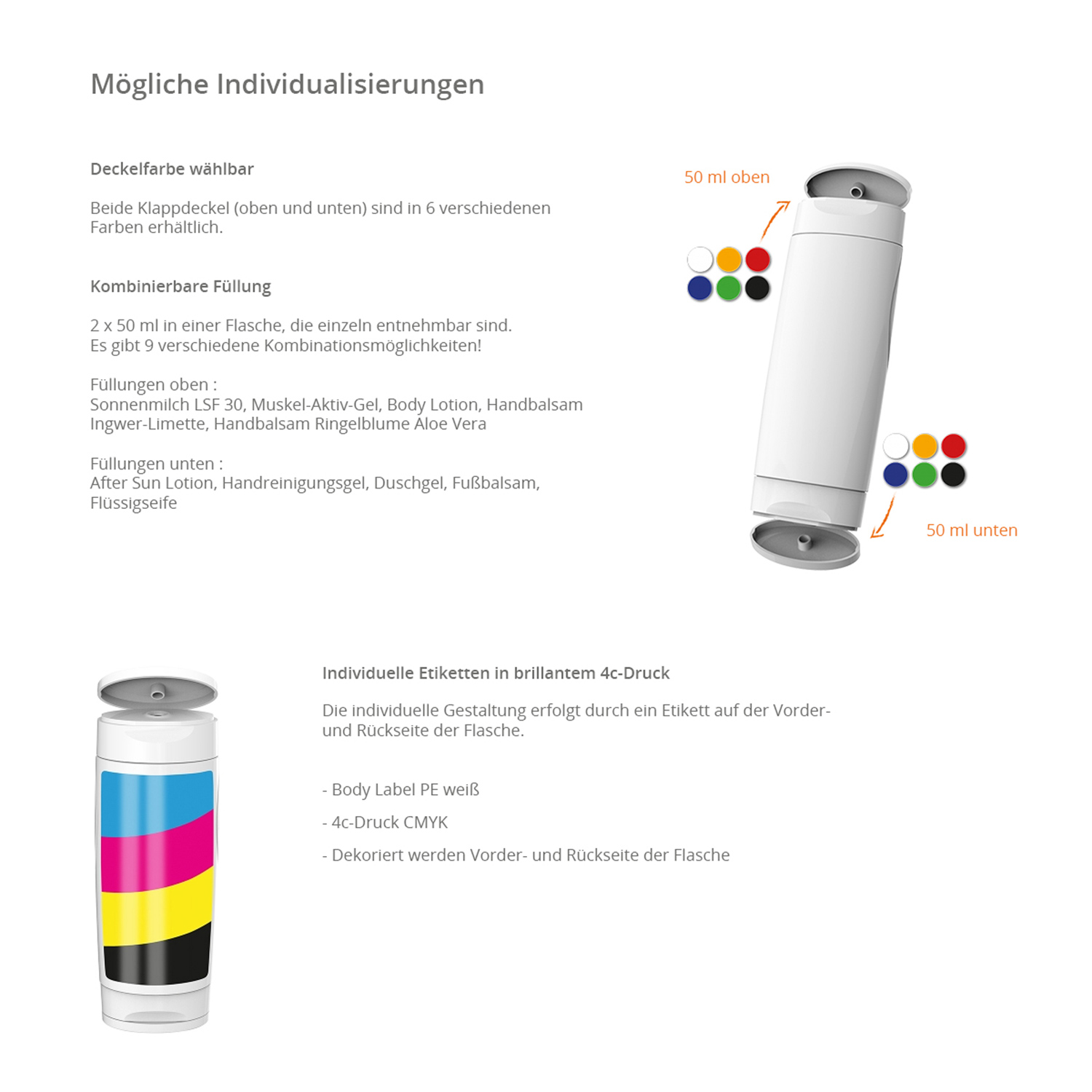 1 Flasche, 2 Füllungen, 9 Kombinationsmöglichkeiten: Die raffiniert entwickelte "Double Bottle" enthält 2 x 50 ml mit hochwertigen Pflegeprodukten für jedes Einsatzgebiet und jede Zielgruppe. Sie können verschiedene Füllungen kombinieren, Ihre Klappdeckelfarbe wählen und die Etiketten in brillantem 4c-Druck bedrucken.