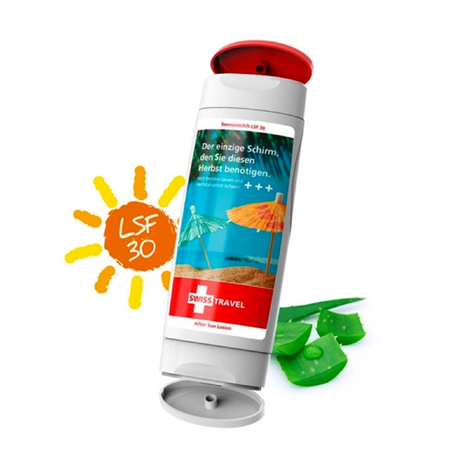 Preisbeispiel ab 500 St., Füllung: Sonnenmilch sensitiv LSF 30 + Aftersun Lotion, inkl. 4c-Druck zzgl. Druckvorkosten.