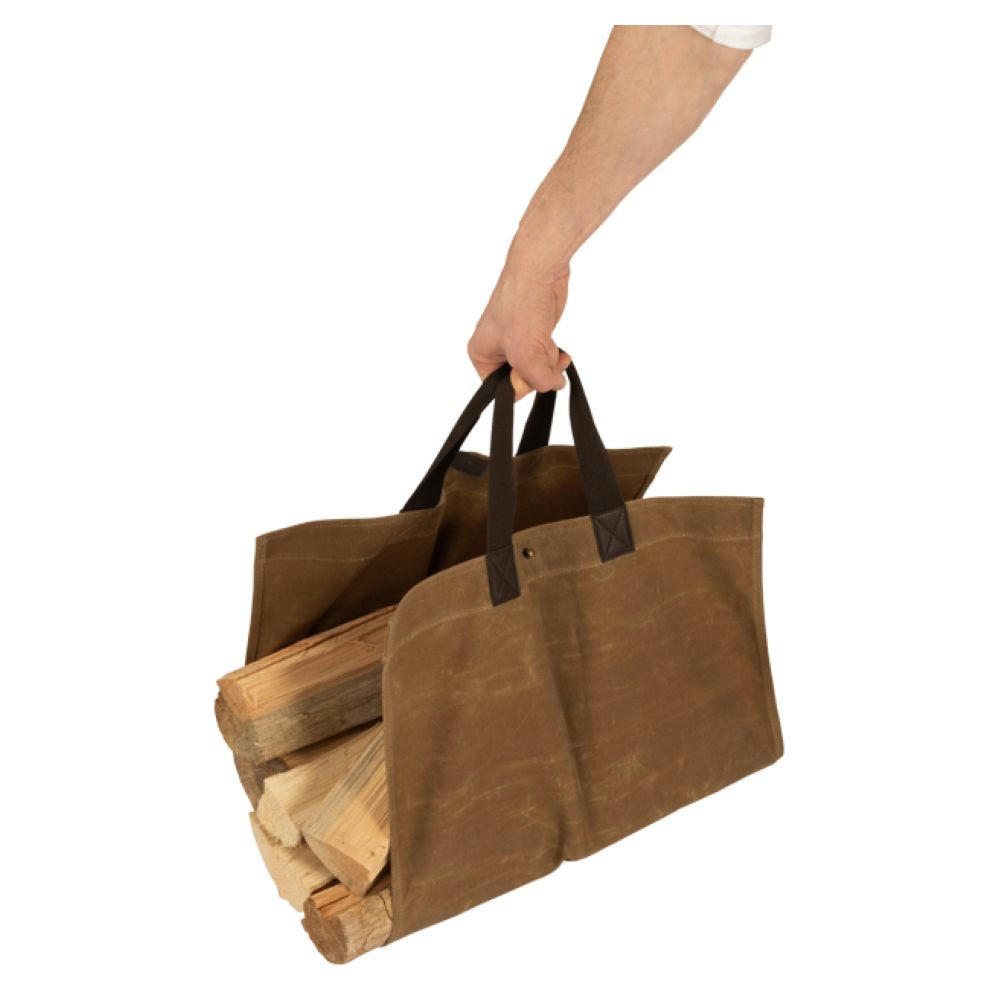 Gewachste Baumwolle, Träger aus dunkelbraunem Webband, Akzente in Lederimitat.