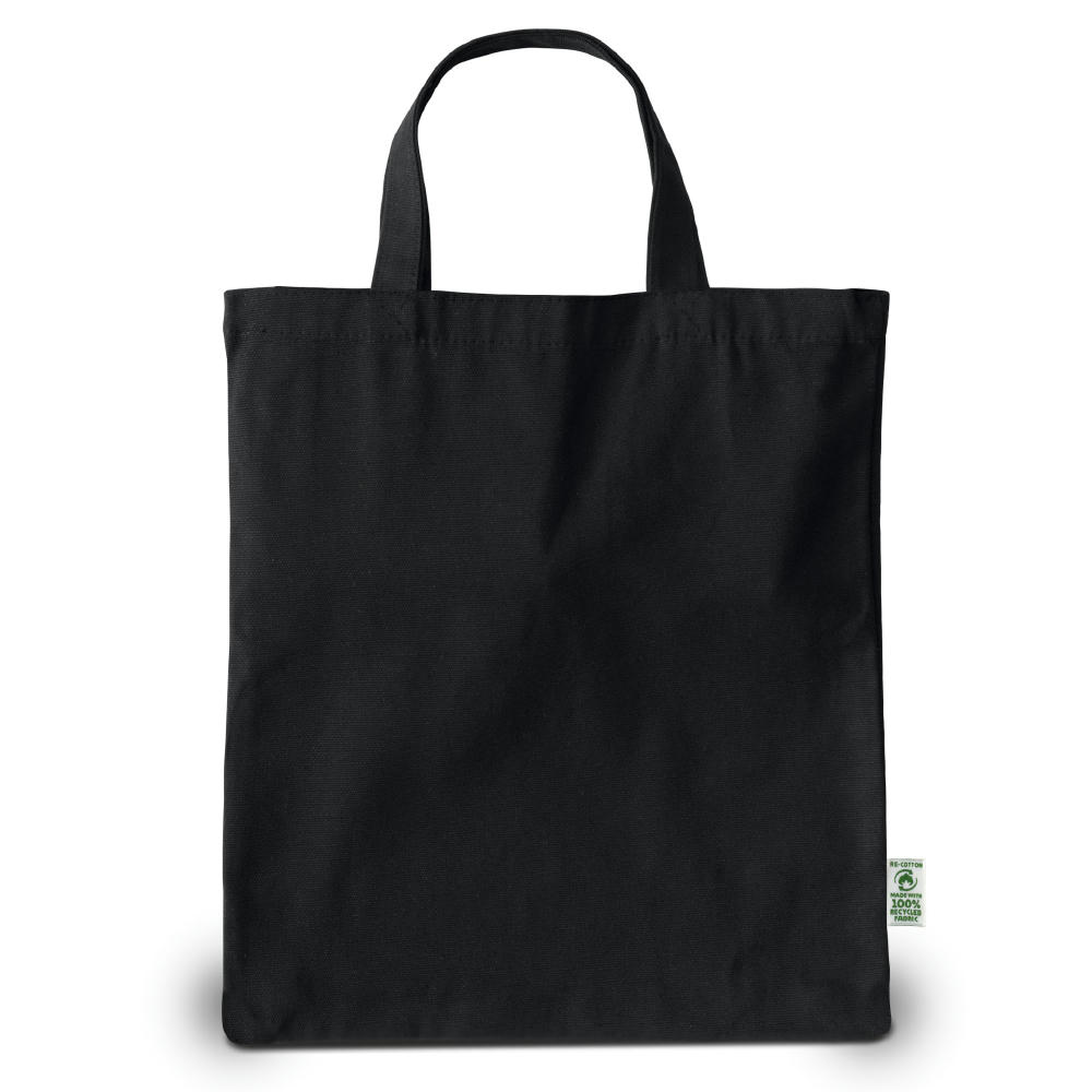 Tasche aus recycelter schwerer Baumwolle mit kurzen im Kreuzstich vernähten Henkeln und RE-cotton label aussen. Gegen Aufpreis auch mit langen Henkeln erhältlich.