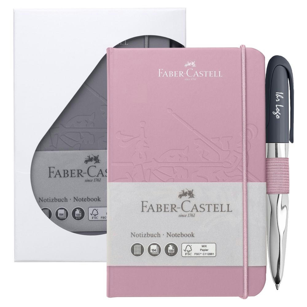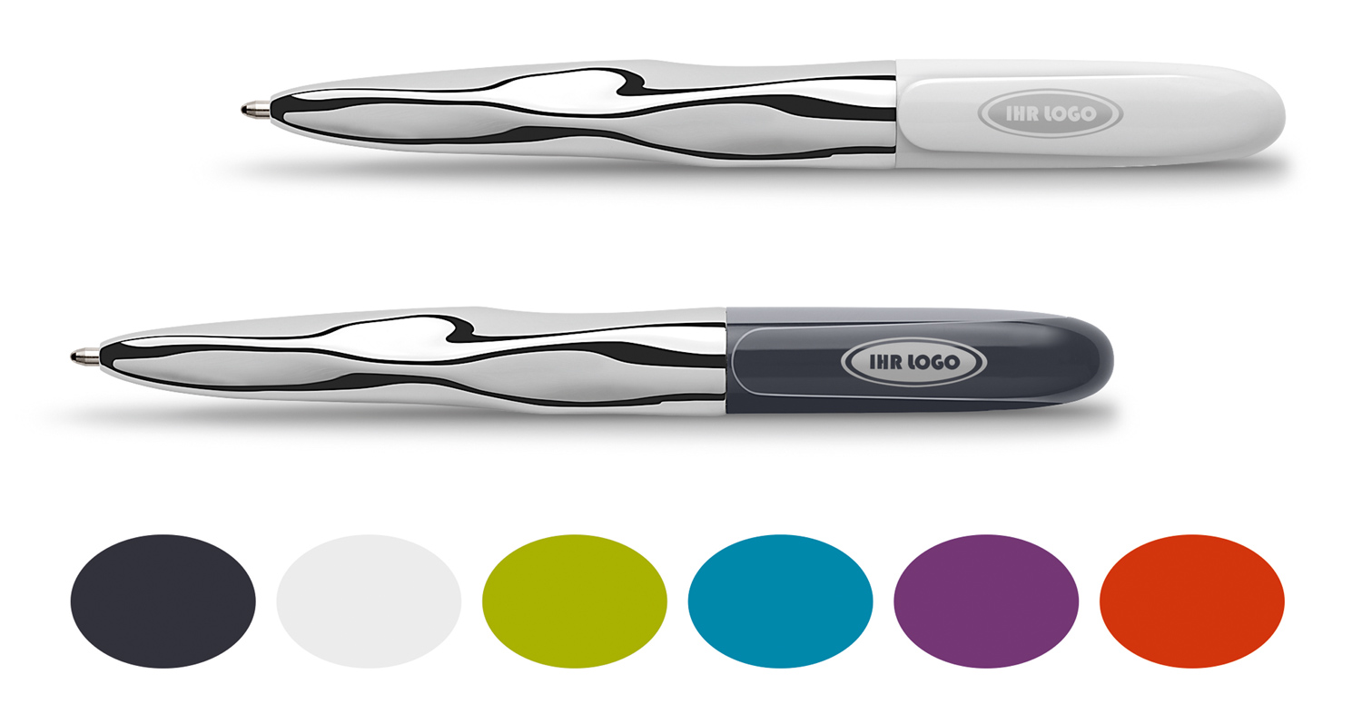 Das hochwertige Notizbuch, ideal für Büro, Studium und unterwegs in A6, 90 x 140 mm. 194 Seiten mit kariertem 100g/qm Papier. Eingesteckt in die seitliche Schlaufe ein Kugelschreiber níce pen. Ausgestattet mit einer „extra weich" und blau schreibenden, dokumentenechten ISO-Standard-Grossraummine XB = extra broad. Zusammen im weißen Geschenketui. Preis Stück inkl. 1-farbigem Druck auf der Kappe.