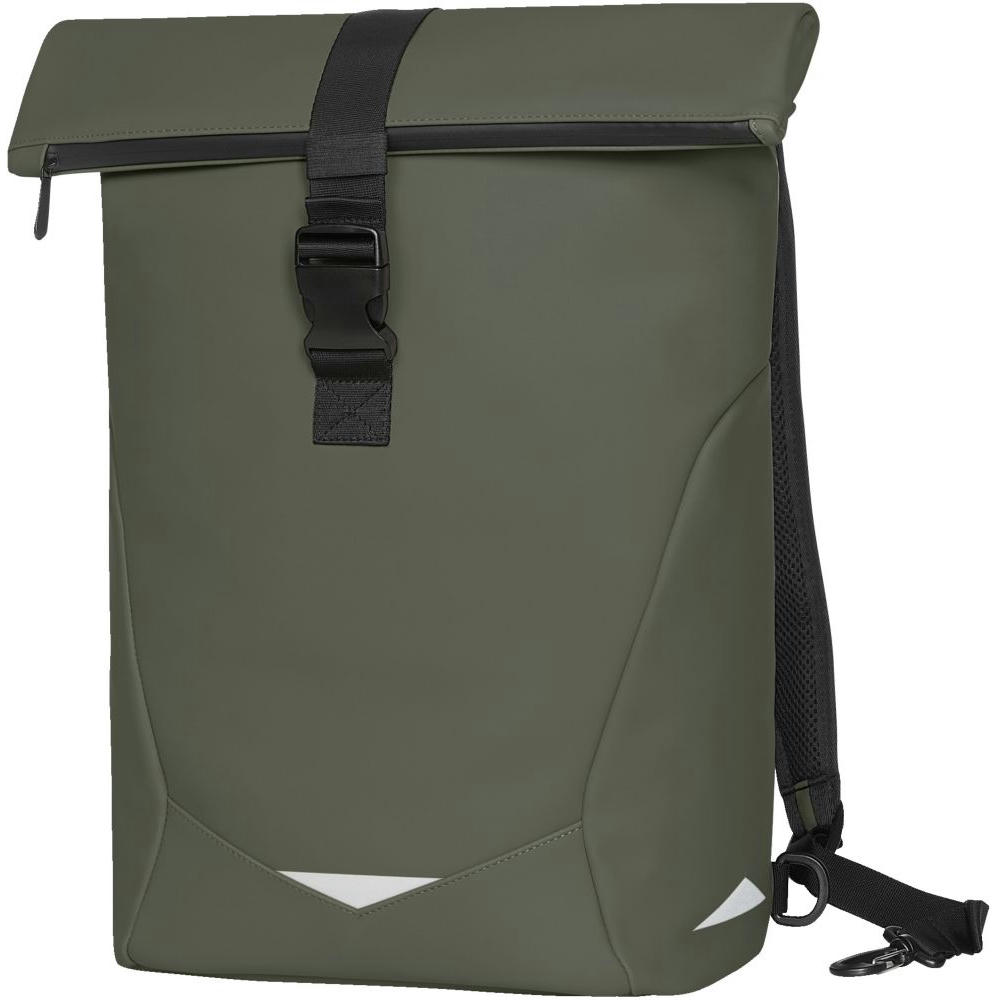 dynamischer Rolltop-Rucksack mit wasserdichten Reißverschlüssen; Recycling-Oberstoff mit Wasserabperl-Effekt; Reißverschluss-Hauptfach mit zusätzlichem Steckverschluss; große Reißverschluss-Vortasche; dekorativer Reflexdruck auf Front und Seiten; innen gepolstertes Einsteckfach mit Klettsicherung; Airtag-Einsteckfach; Befestigungsschlaufe für Trolley-Gestänge; rückseitig Halterungen für den Fahrradgepäckträger; versenkbare, gepolsterte Schultergurte mit individuell einstellbarem Brustgurt; Handgriff