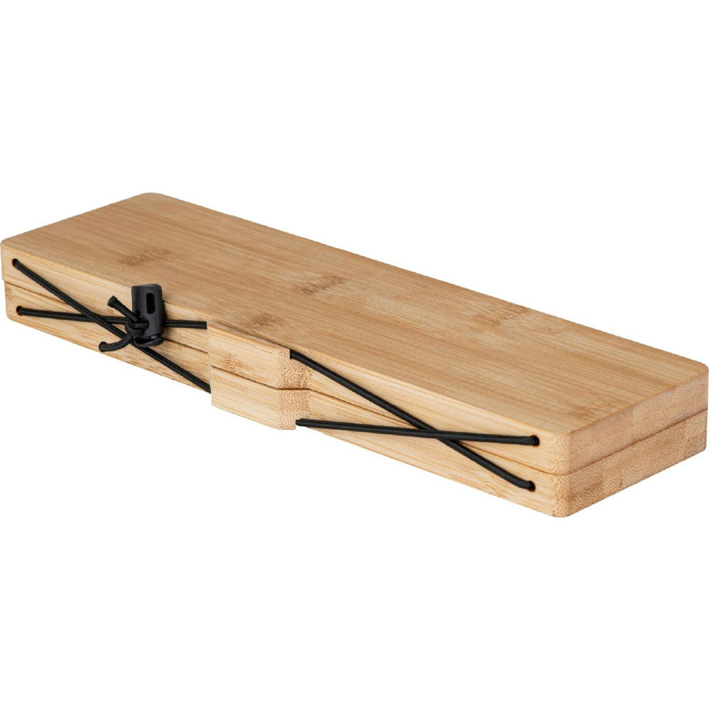 Material: naturbelassenes Bambus, Edelstahl. Maße: 29 x 9,3 x 3,1 cm (geschlossen), 29 x 18,6 x 1,55 cm (geöffnet).