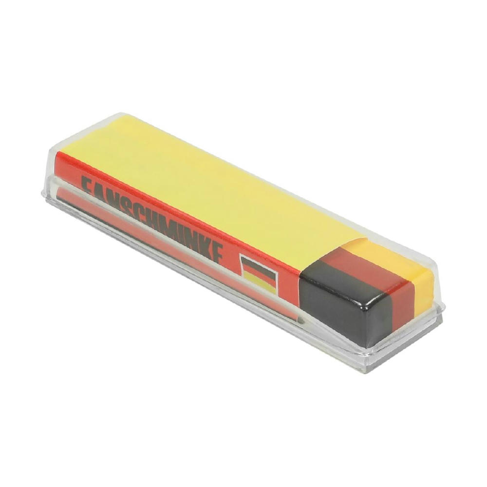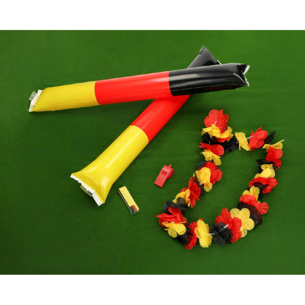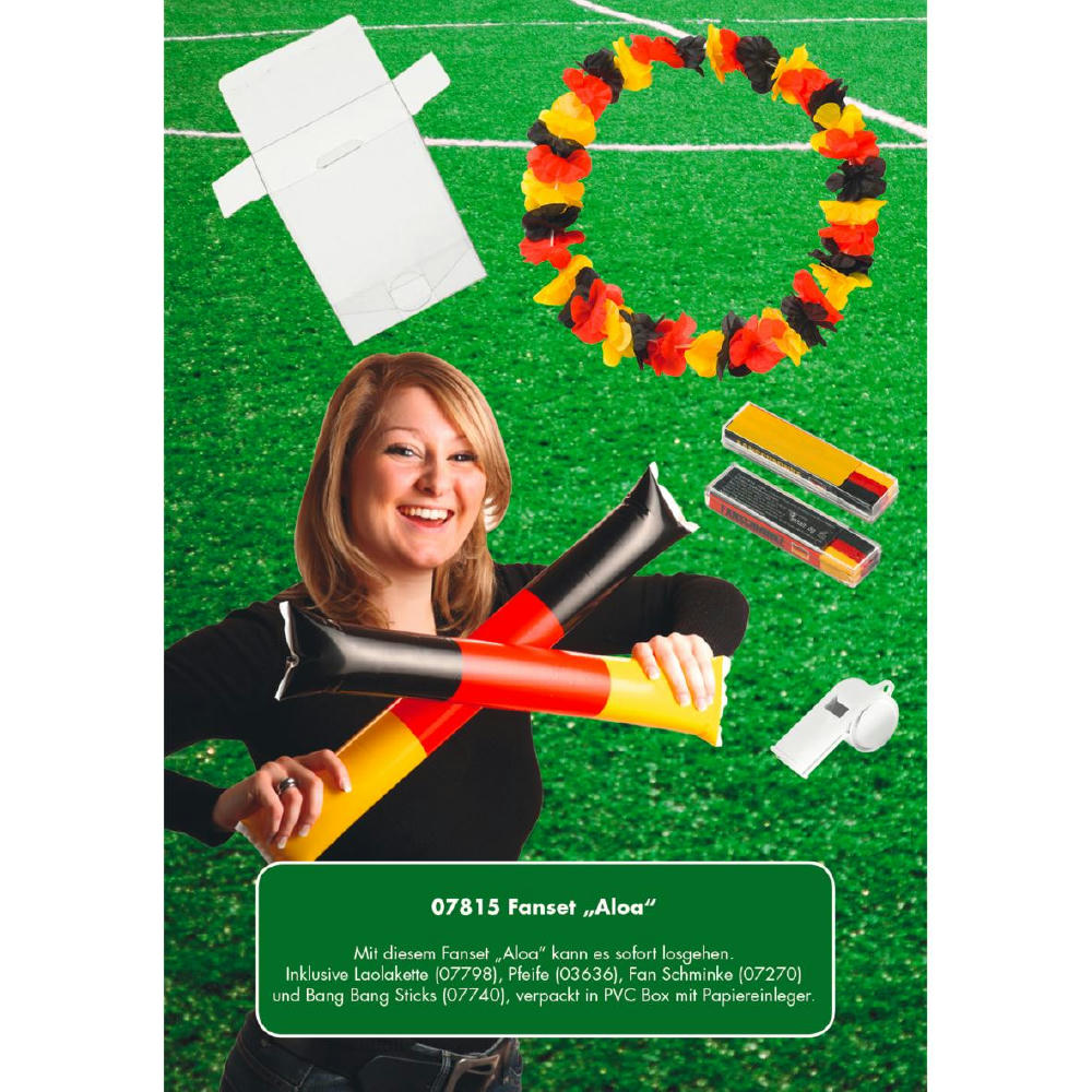 Inklusive Laolakette (07798), Pfeife (03636), Fanschminke (07270) und Klopfschlauch "Sticks" (07740), verpackt in PVC Box mit Papiereinleger. Beim Einleger kann zwischen Standard (siehe Abbildung) oder einem individuell gestalteten Einleger gewählt werden.