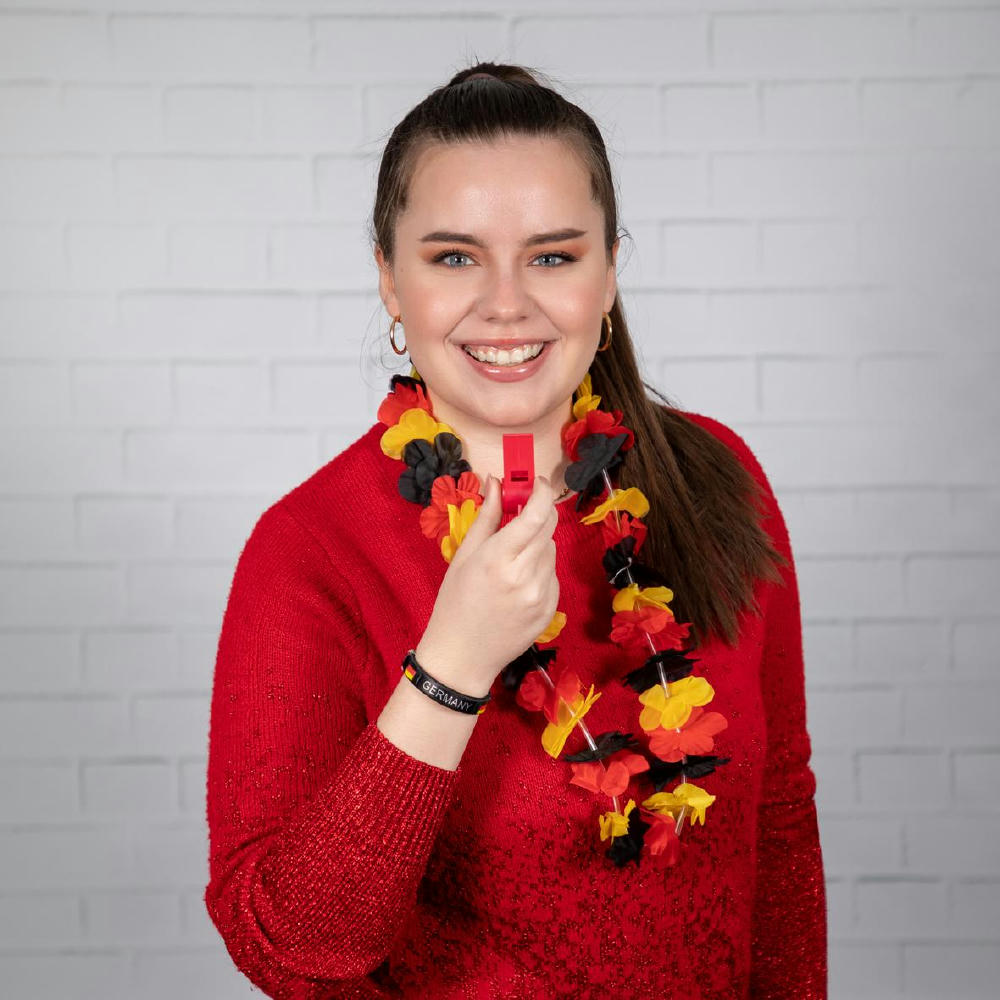 Das Rundumpacket für echte Fans! Inklusive Blumenkette in Deutschlandfarben , schickem Fanarmband, lautstarker Trillerpfeife und Fanschminke. Der beiliegende Einleger kann auf Wunsch individuell gestaltet werden.