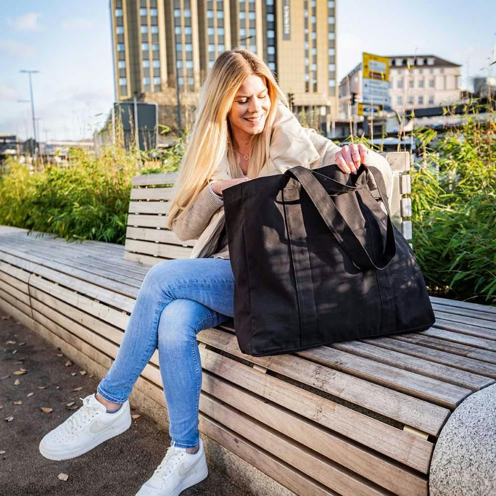offenes Hauptfach, Vortasche ca. 28 x 18 cm, 2 x kurze Tragegriffe ca. 4 x 31 cm und 2 x lange Tragegriffe ca. 4 x 70 cm , Volumen ca. 39 l.
