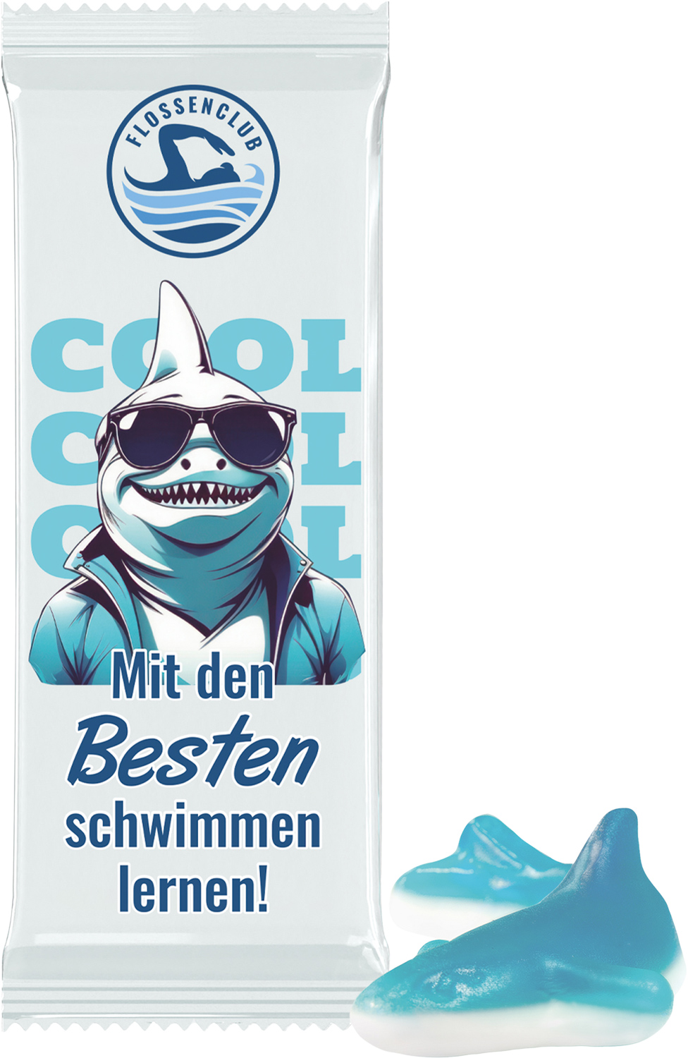 Flowpack aus transparenter Folie, individuell bedruckt. Inhalt: 1 Trolli Fruchtgummi "Haifisch" blau, mit weißem Schaumzuckerbauch, 8g, Sonderfarben und -geschmacksrichtungen ab 50.000 Stück auf Anfrage. Inkl. 1-4c-Druck.