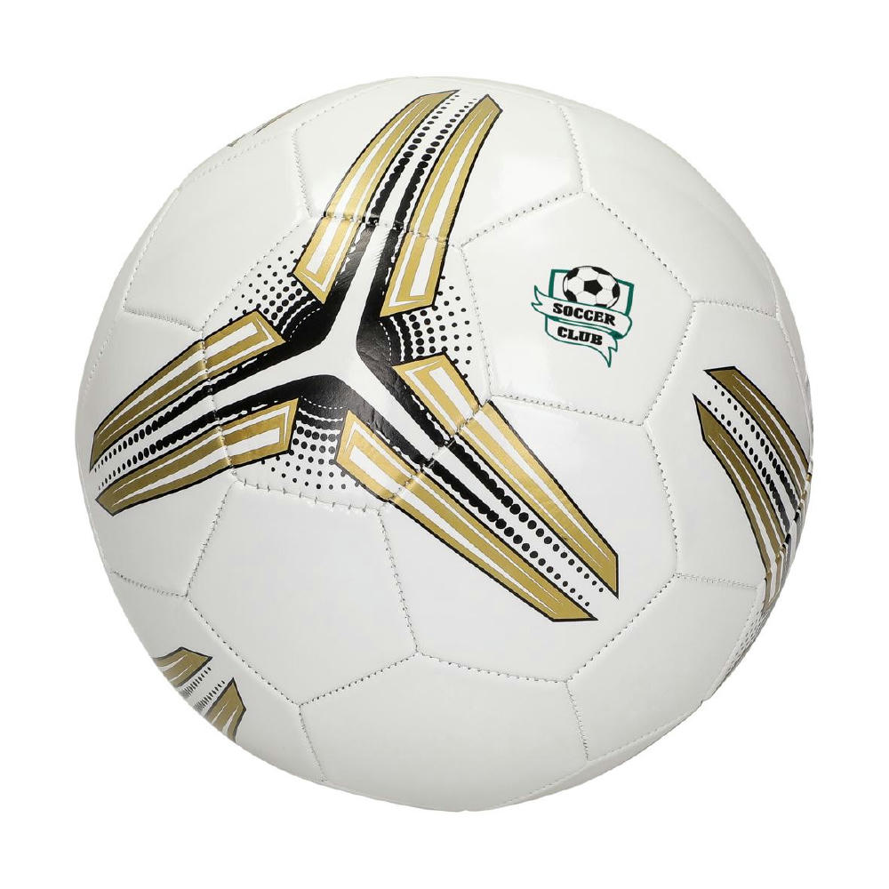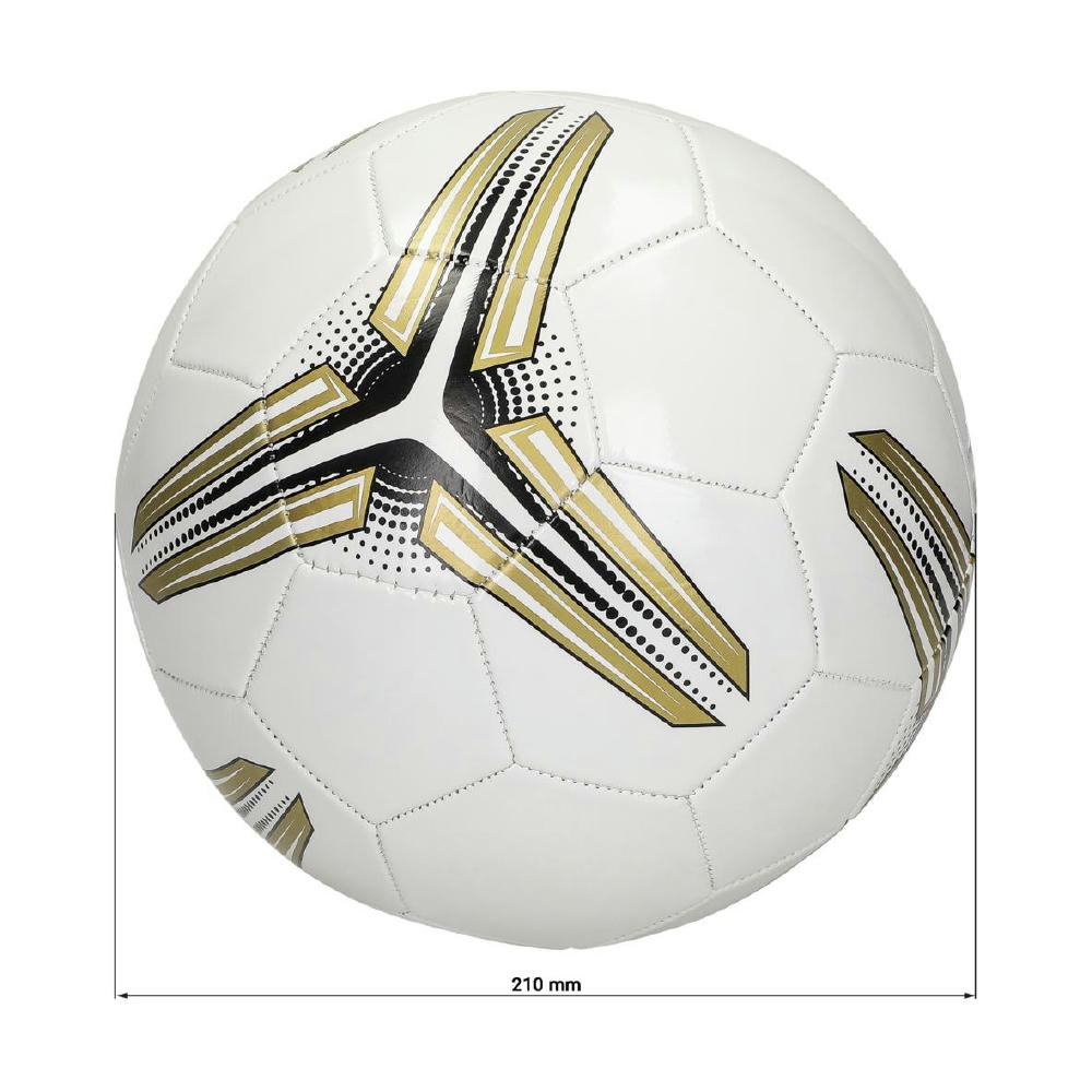 Maschinell genähter Fußball aus PVC in weißer Grundfarbe mit aufgedrucktem Muster in gold und schwarz. Größe 5. Der Ball ist 3-lagig und hat 32 Panele. Er verfügt über eine Dicke von 1,6 mm, ein Butyl-Ventil und eine Latex-Blase.