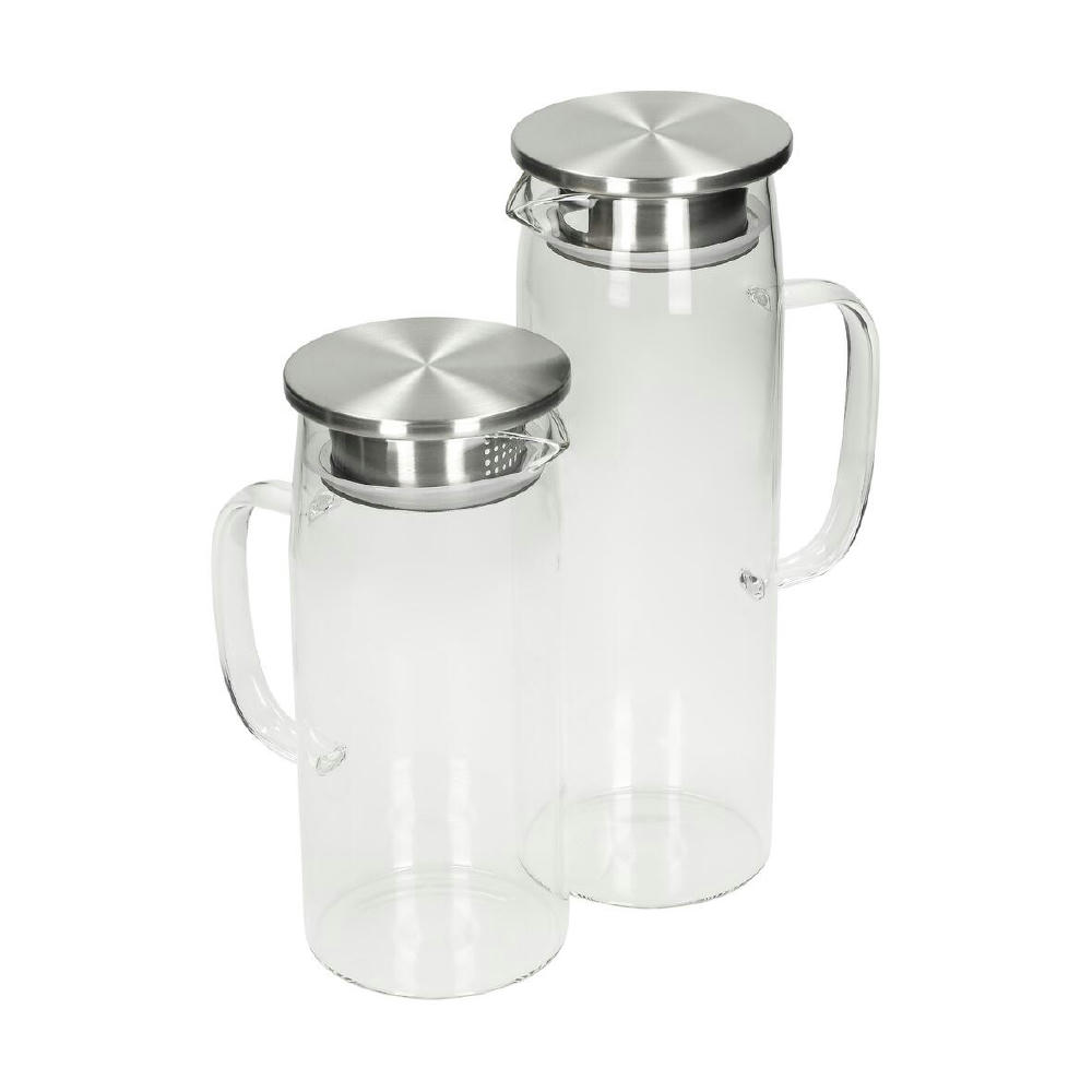 Karaffe aus Borosilikatglas mit Edelstahl- und Silikonelementen. Mit 1 l Füllvolumen ideal für Wasser, Saft oder Eistee. Durchdachtes Design für einfache Handhabung und leichte Reinigung. Stilvoll, funktional und perfekt für Alltag oder Büro.