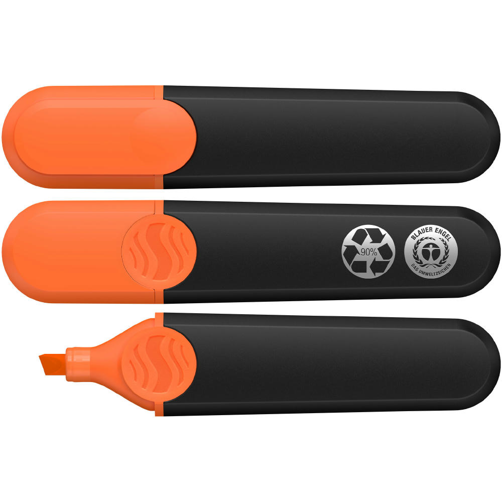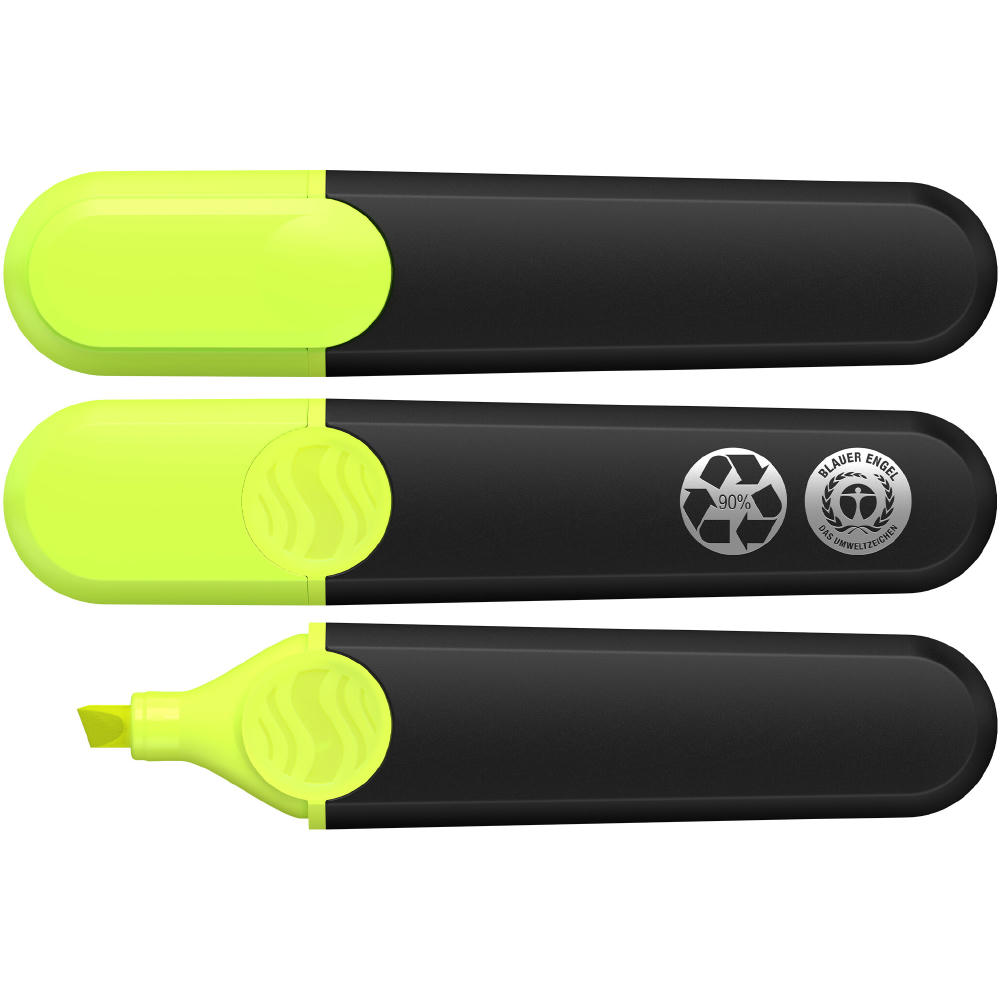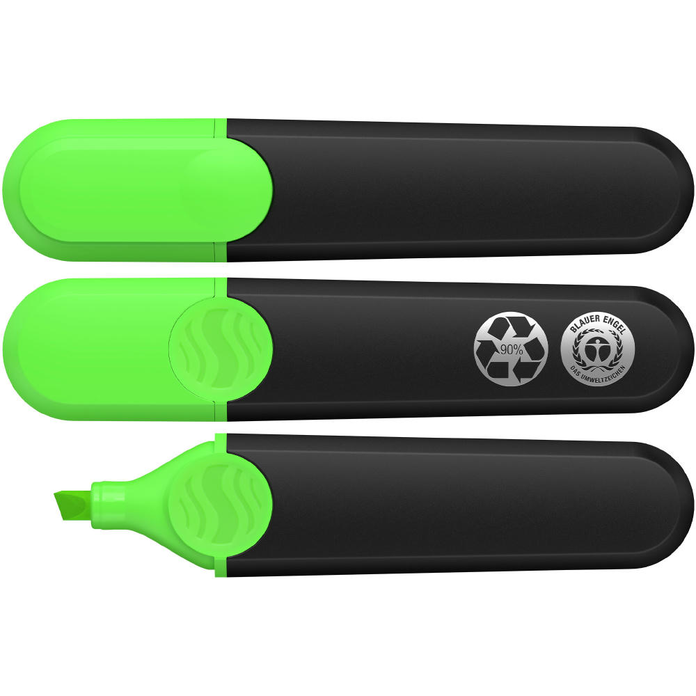 Textmarker aus opakem Kunststoff mit fein mattierter Oberfläche. Ausgezeichnet mit dem weltweit bekanntesten Umweltzeichen "Blauer Engel". *Gehäuse aus über 90 % recyceltem Kunststoff. Der innere Speicher und die Spitze bestehen aus Recyclingfasern, die Tinte wird aus biobasierten Rohstoffen hergestellt. Leuchtstarke, lichtbeständige Tinte. Für Normal-, Copy- und Faxpapier. Keilspitze 1+5 mm. Produkt mit finanziellem Klimabeitrag: Kompensation in Höhe der unvermeidbaren Emissionen in ein zertifiziertes Klimaschutzprojekt. Gehäuse: schwarz/grün. Schreibfarbe: grün.