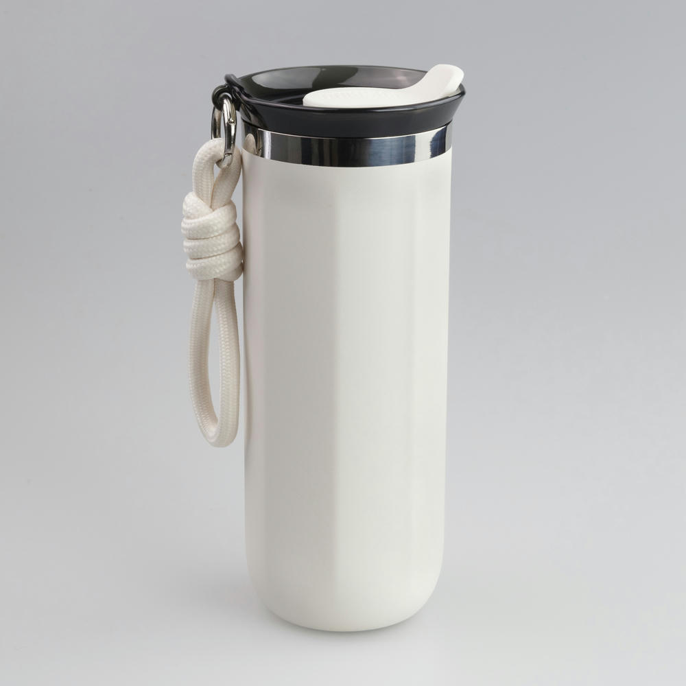 Doppelwandiger Trinkbecher aus Edelstahl mit elegantem weißem Finish und facettierten Seiten. Großer Schraubdeckel, der ein einfaches Befüllen direkt an der Kaffeemaschine ermöglicht, Seilschlaufe als Tragegriff am Deckel, Silikonverschluss. Die doppelwandigen Vakuum-Isolierung aus Edelstahl hält das Getränk – ob heiß oder kalt – stundenlang auf der idealen Temperatur.