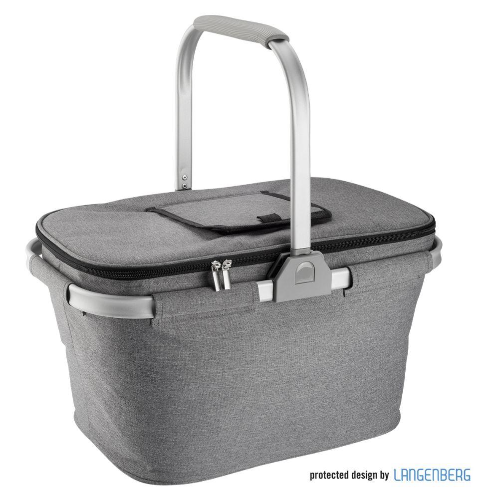 2-Wege Reissverschlusshauptfach, Aluminiumrahmen, klappbarer Aluminiumtragebügel mit grauem Gummipolster, mit integrierten Einkaufschips beidseitig am Gelenk, Deckel mit zusätzlicher Eingriffsöffnung, verstärkter Boden Seiten innen verkleidet mit Isolierung für Kühlfunktion Volumen: ca. 29l.