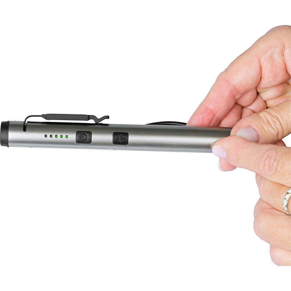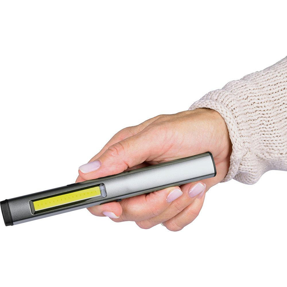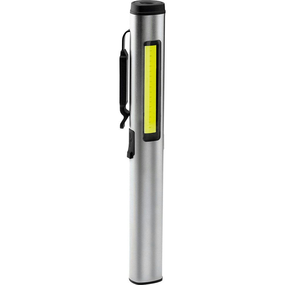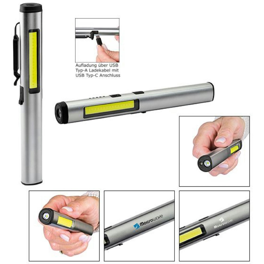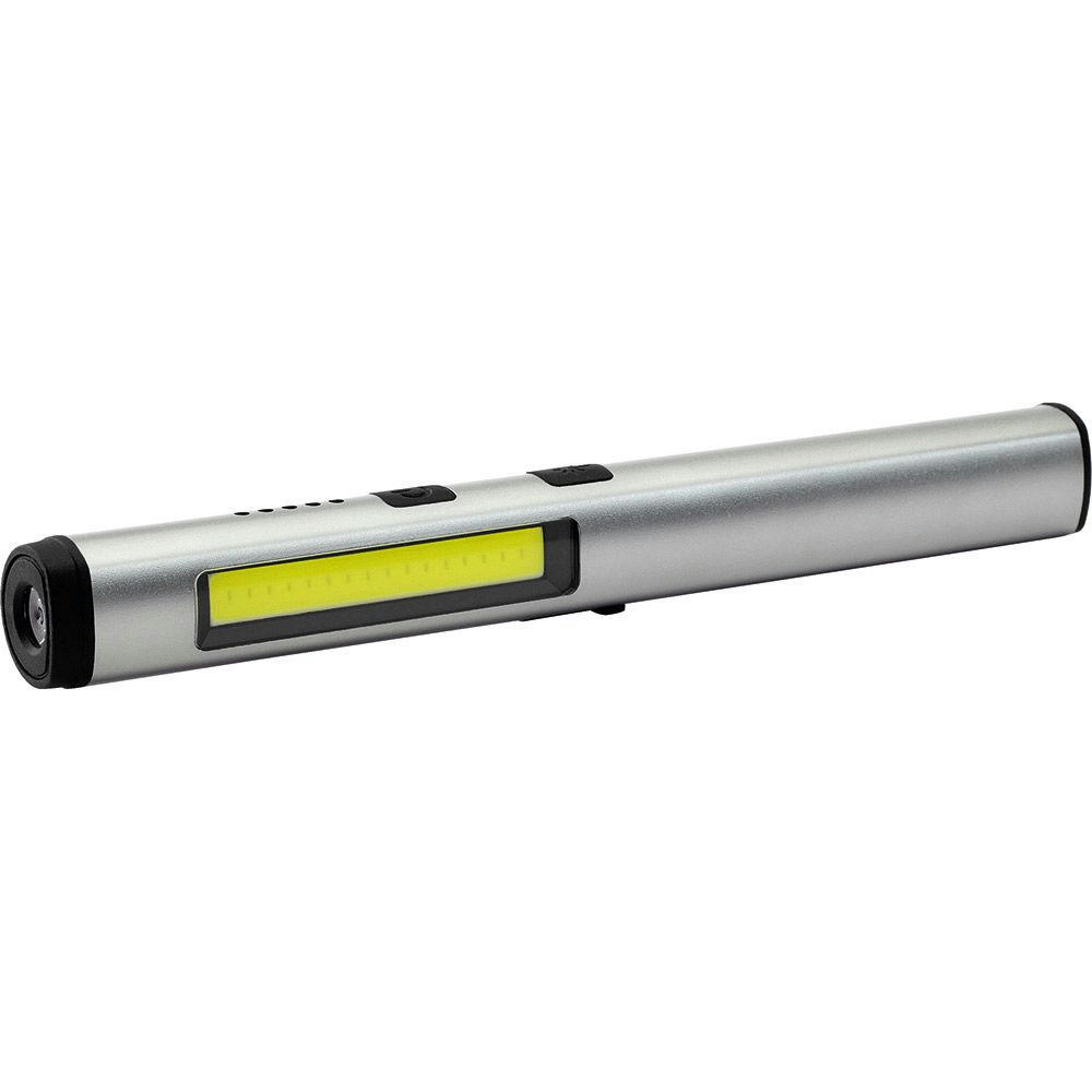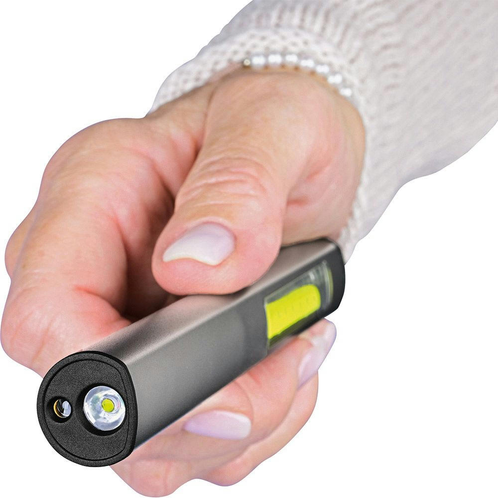 Gehäuse: Aluminium eloxiert. Leuchtmittel: Frontleuchte 5 W COB LED, Inspektionsleuchte 3 W LED, Laser 650 nm, UV-Licht 365 nm. Lichtwerte: Frontleuchte 450 Lumen, Inspektionsleuchte 140 Lumen. Ladezeit: ca. 3 Stunden. Leuchtdauer: ca. 2,5 Stunden (Frontleuchte 450 Lumen), ca. 2,5 Stunden (Inspektionsleuchte 140 Lumen), ca. 4 Stunden (UV-Licht). Leuchtmodi: Frontleuchte 100 % Power weißes Licht dimmbar, Inspektionsleuchte 100 % Power weißes Licht dimmbar, UV-Licht blau dimmbar, Laser rot. Equipment: 120° drehbarer Clip mit starkem Magnet, Ladekontroll-LED, USB (Typ A) / USB (Typ C) Ladekabel (50 cm Länge). Schutzklasse: IPX2. Stromversorgung: 3,7V 800mAh Li-Ionen Akku Typ 14500 (inkl.). Verpackung: schwarze Geschenkverpackung.