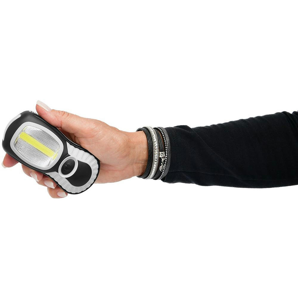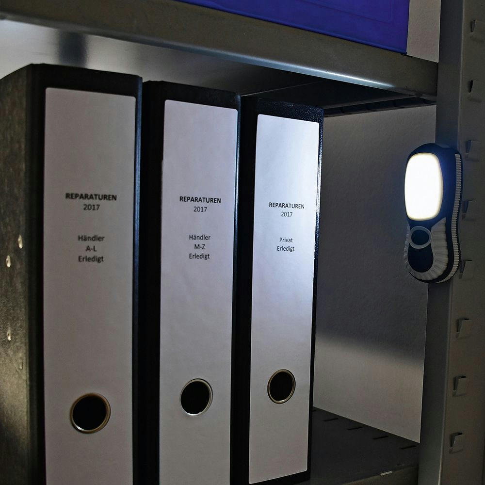 Arbeitsleuchte mit 3W COB LE D und 3 DIP LE D. Lichtwerte: Arbeitsleuchte 230 Lumen, Taschenleuchte 30 Lumen. Leuchtdauer: ca. 20 Std. Leuchtmodi: 100% Power weißes Licht. Starker vernickelter Magnet, 360° drehbarer Fixierhaken. Inkl. 3 AAA Batterien. In schwarzer Geschenkverpackung.