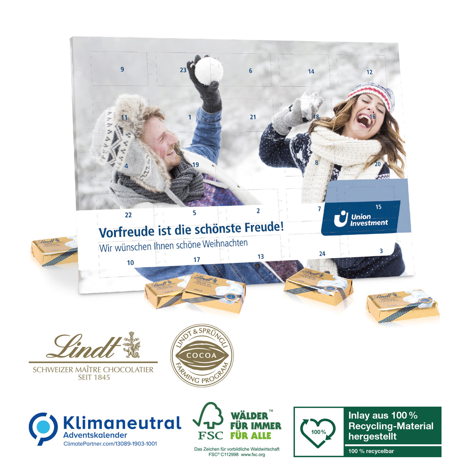 Adventskalender in Vollkartonhülle, Querformat, mit Tischaufsteller zum Ausklappen. 24 Stück (ca. 120 g) Markenschokolade von LINDT. In Klarsichtverpackung. Produkt mit finanziellem Klimabeitrag. Preis inkl. 4c-Druck.