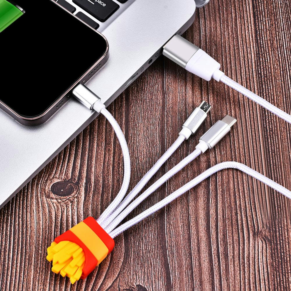 Innovatives 5-in-1 Ladekabel mit vielseitigen Anschlüssen: USB-A mit einem USB Typ C Adapter als Eingang und Ausgänge für iPhone Lightning, Type C sowie Micro USB. Kabel und Stecker wahlweise in Schwarz oder Silber. Der mittlere Teil kann in Größe, Farbe und Design individuell gestaltet werden – die Optionen sind nahezu unbegrenzt! Leistung: 5V / 2.1A; Länge: ca. 110 cm.