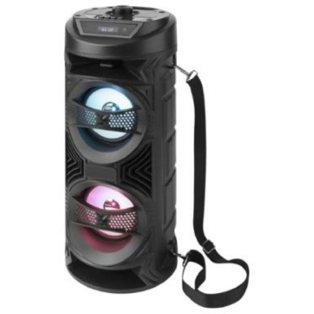 2x 5 Watt, Subwoofer, Musik per blue wireless 5.0, AUX oder mittels des integrierten FM Radios. Eingebaute, wiederaufladbare Batterie für 2-4 h - mit Micro für Ansagen, Stimmung & Gesangseinlangen - inkl praktischem Tragegurt.