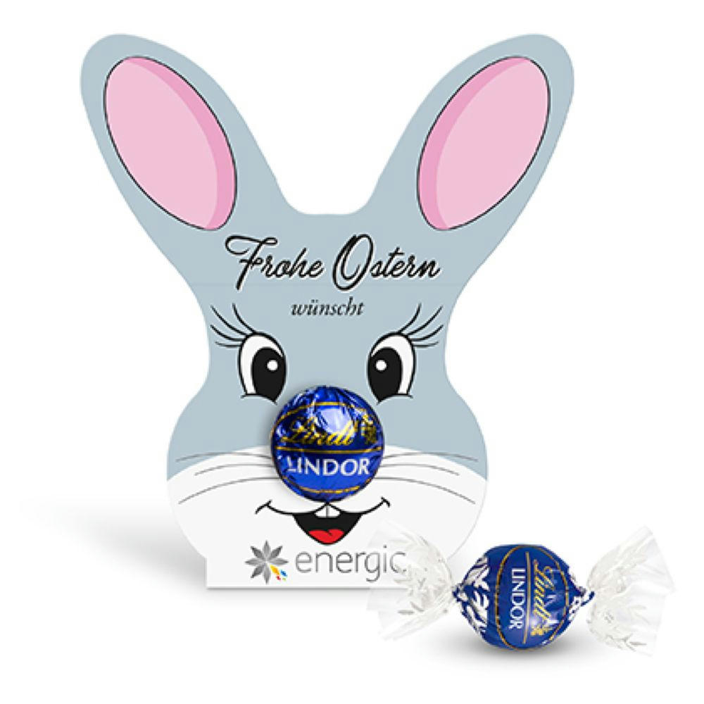 Feinste Lindor Kugel aus Milchschokolade oder Schokolade feinherb in individuell bedruckter Klemmkartonage in Form eines Osterhasen. Variante : Lindt Lindor Kugel in Werbekartonage "Osterhase" | 12,5 g | Milchschokolade | Kartonage | 4c Euroskala