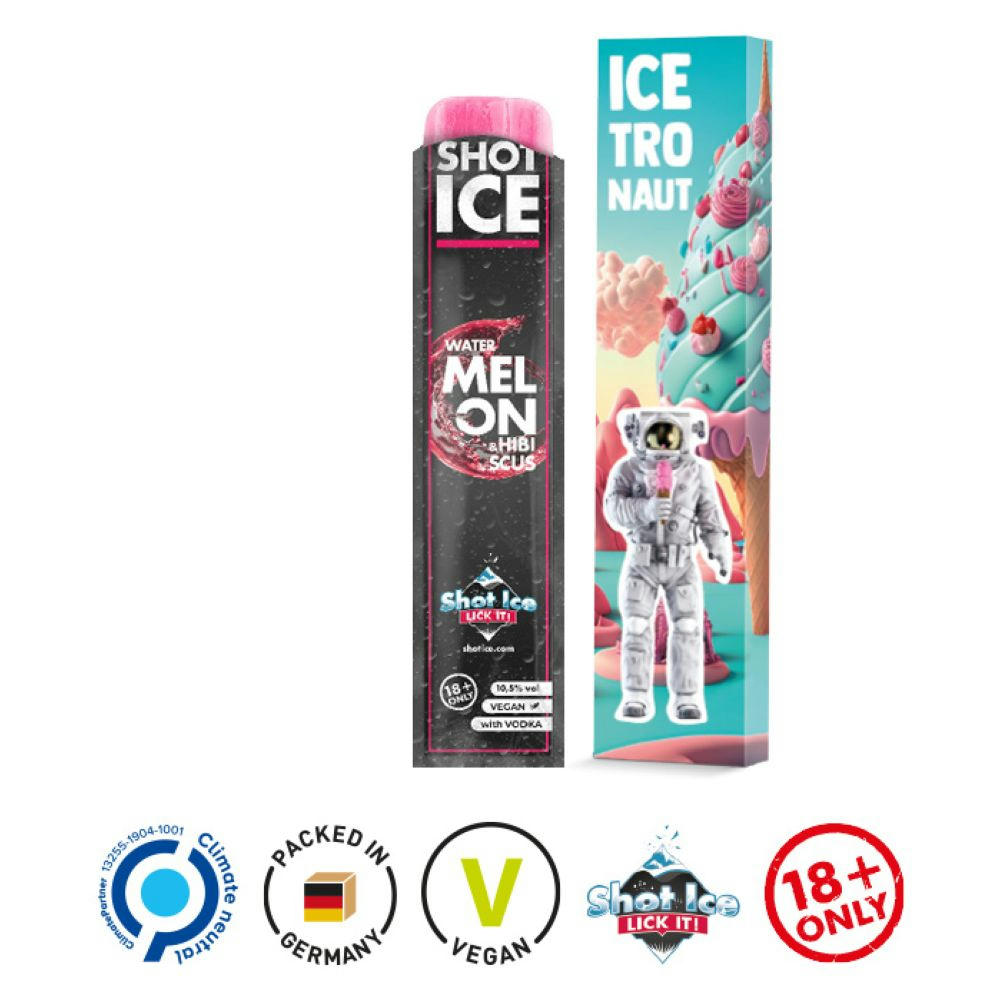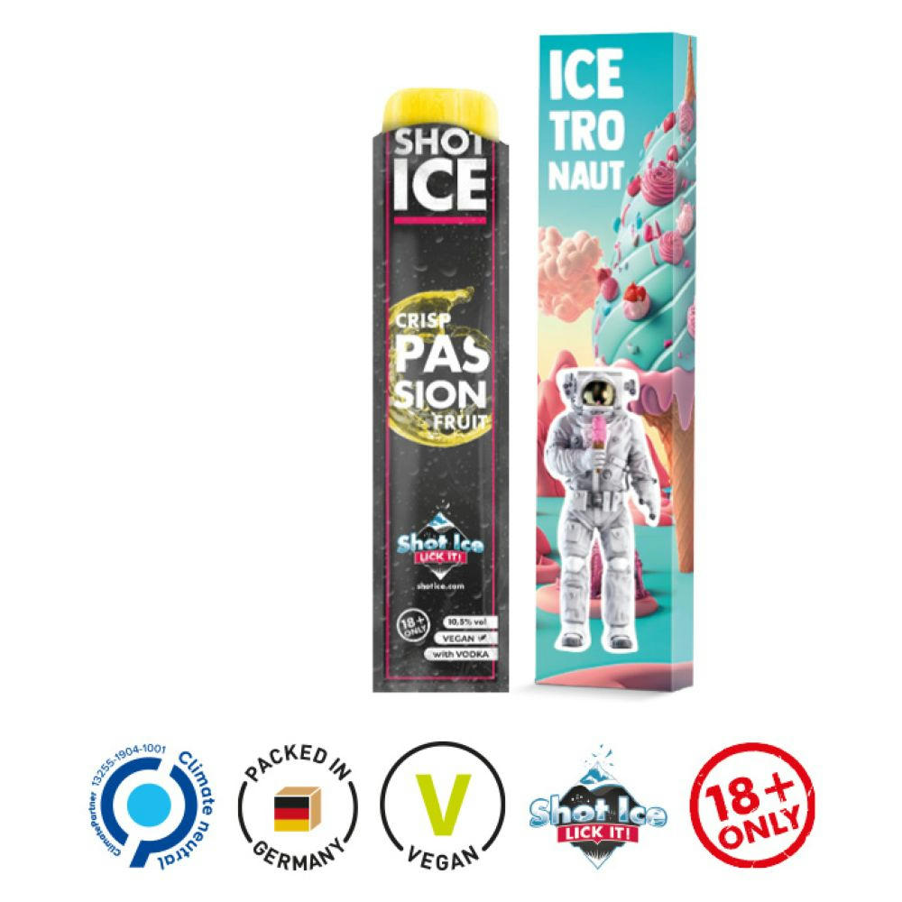 Werbeverpackung, aus weißem Karton, individuell bedruckt. Inhalt: Ein Shot Ice in der alkoholhaltigen Sorte Blackberry Cannabis, 40 ml. Wassereis zum Selbsteinfrieren. Exklusiv! Nur bei uns im Werbemittelbereich!