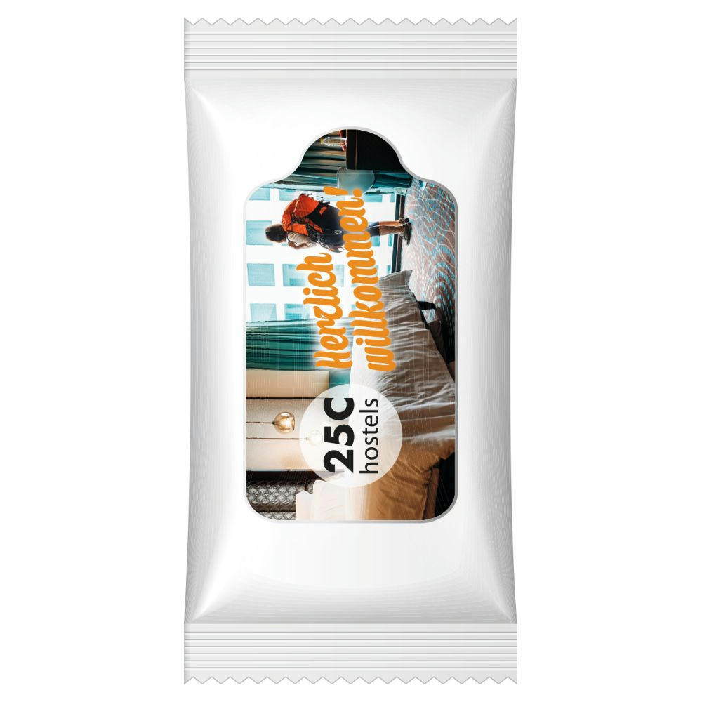 10 Feuchttücher, verpackt in Flow-Pack Folie in weiß. Duftrichtungen: Dove, Cool Water, Mixed fruit.
