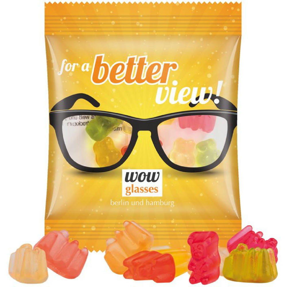 Gummibärchen in Tüte aus transparenter Folie, individuell bedruckt. Inhalt: Basic Gummibärchen, bunt gemischt, 7 g