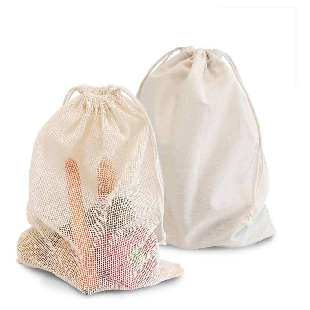 Zugbeutel aus 100 % OEKO-TEX® Baumwolle, 140 g/m². Er ist mit einem robustem, langlebigen Baumwoll-Netz, mit Tara-Innendruck (39 Gramm) versehen.