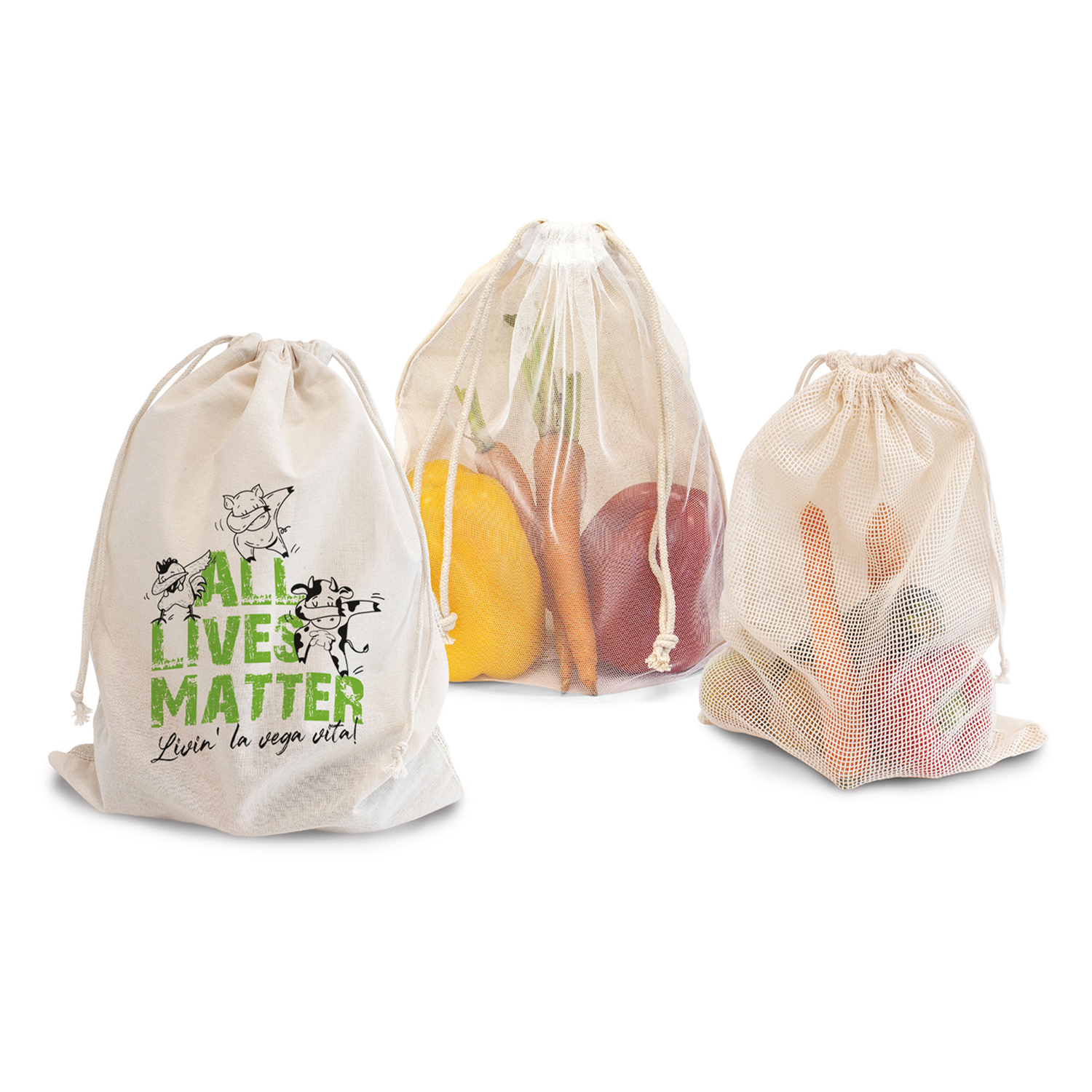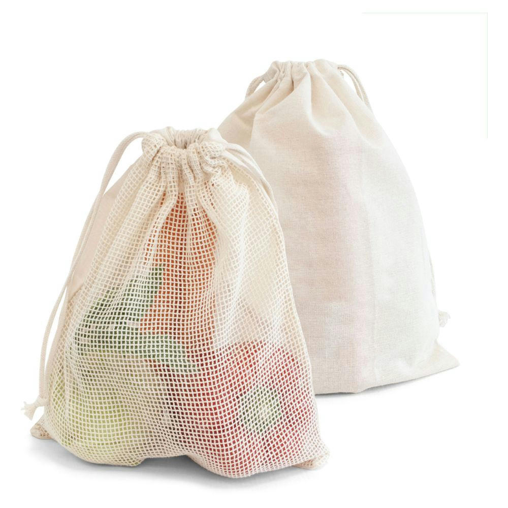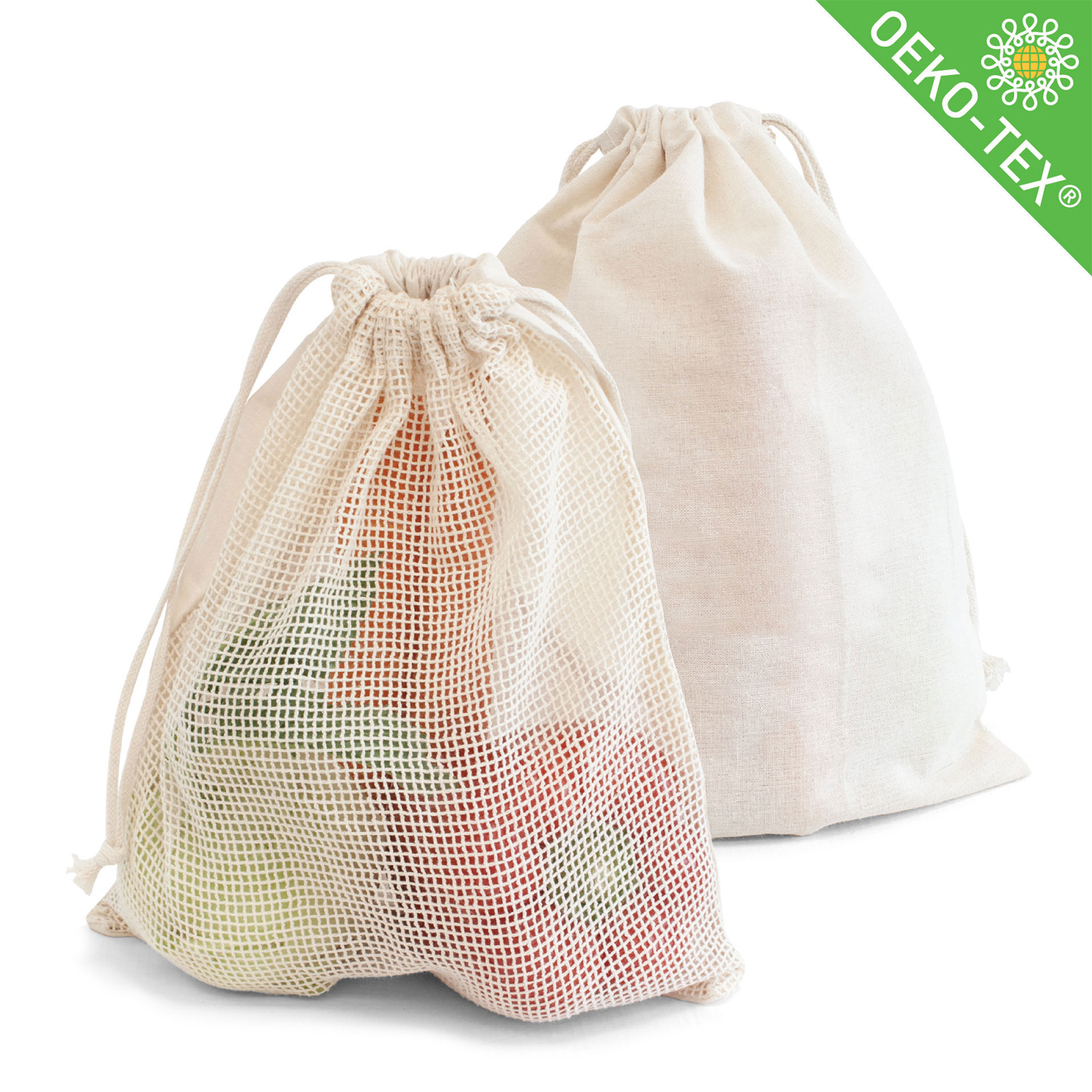 Zugbeutel aus 100 % OEKO-TEX® Baumwolle, 140 g/m². Er ist mit einem robustem, langlebigen Baumwoll-Netz, mit Tara-Innendruck (26 Gramm) versehen.