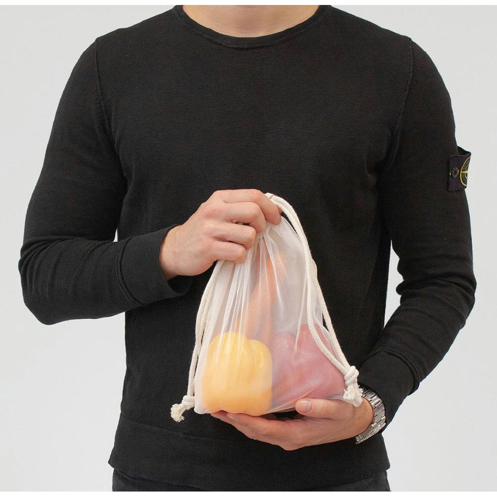 Zugbeutel aus zwei Materialien, auf der einen Seite 100 % Öko-Tex-Baumwolle auf der anderen Seite mit Nylon-Netz.