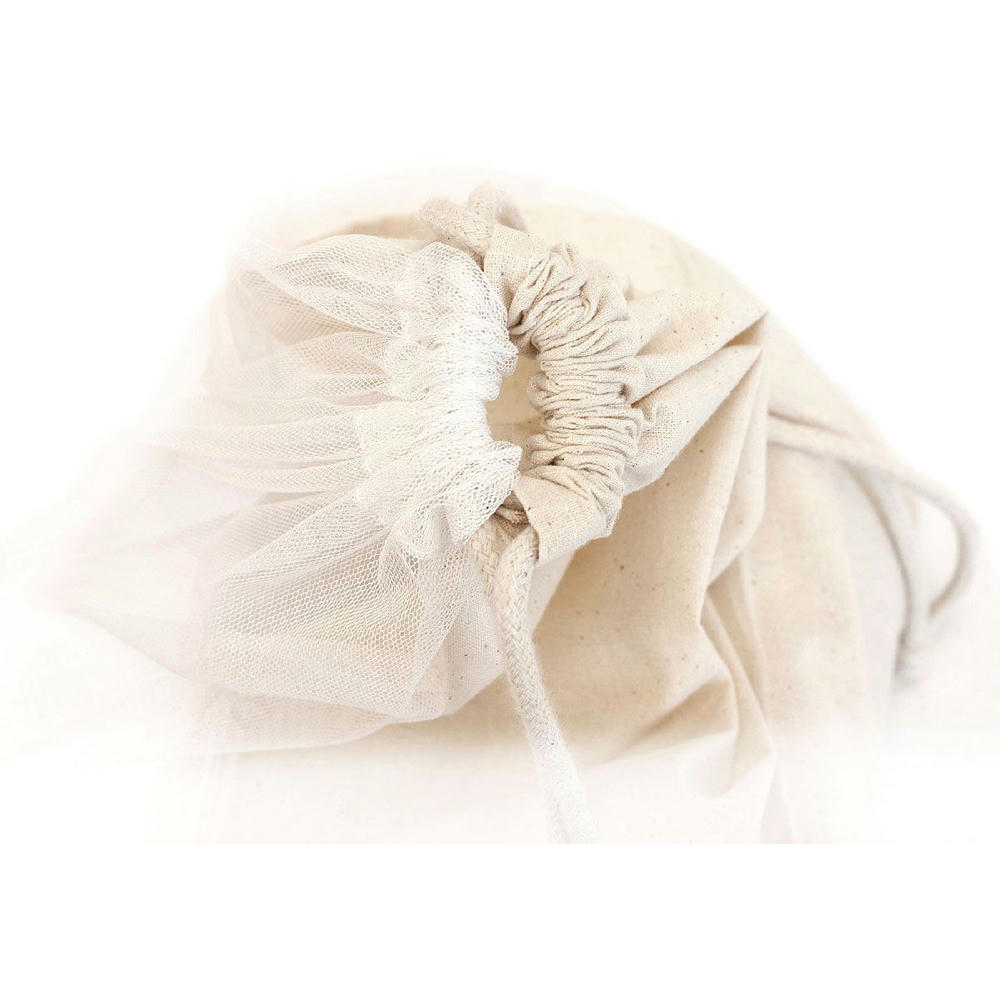 Zugbeutel aus zwei Materialien, auf der einen Seite 100 % Öko-Tex-Baumwolle auf der anderen Seite mit Nylon-Netz.