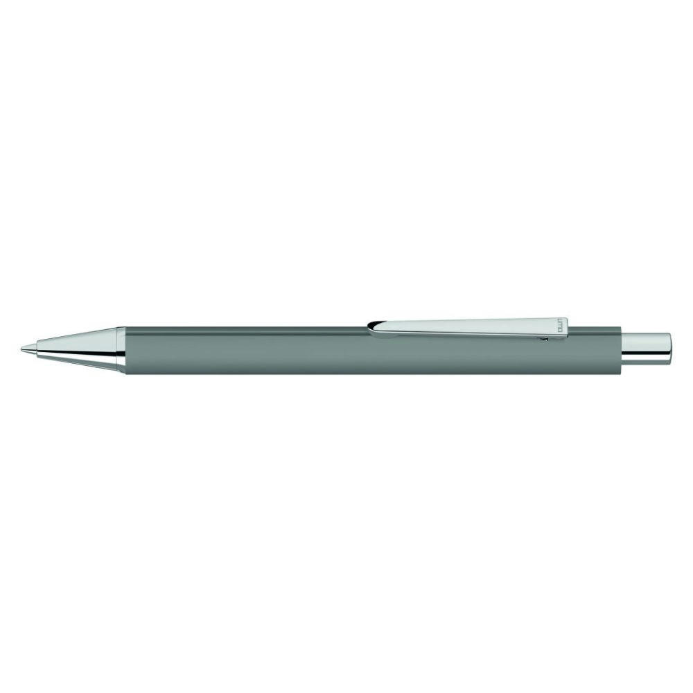 Metall-Druckkugelschreiber mit Softtouch-Dreikantgehäuse, Metallclip, Metallspitze und Drücker in silber glänzend.