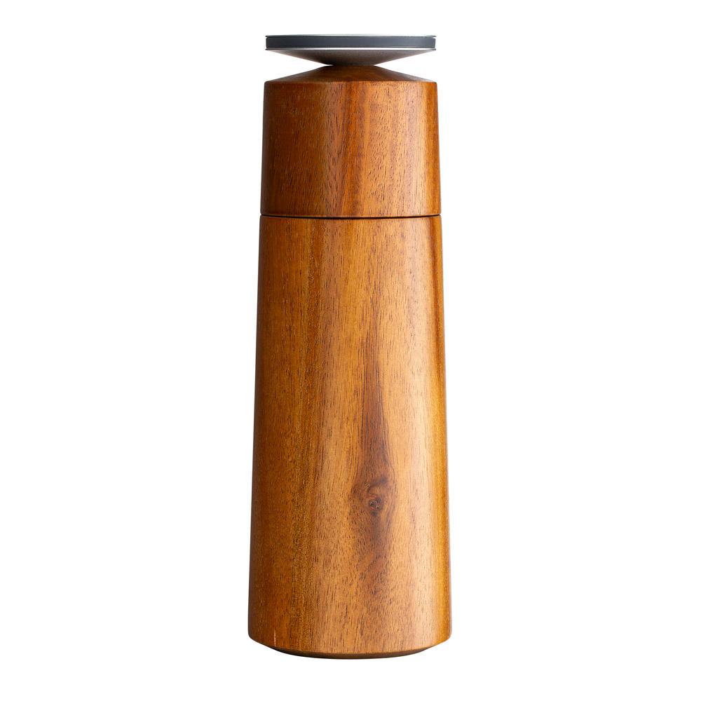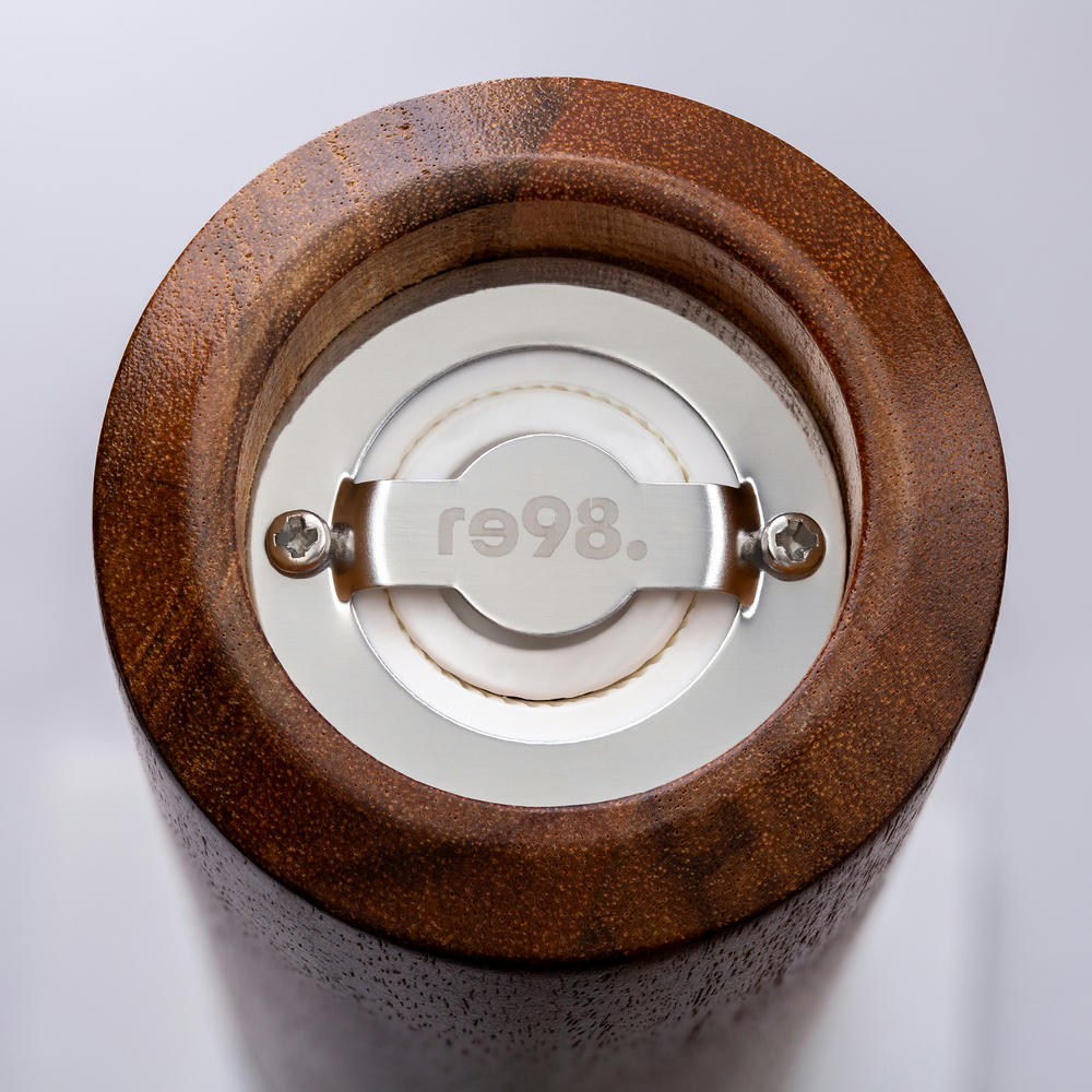 Die aus echtem Akazienholz und Aluminium gefertigte Salz- oder Pfeffermühle verfügt über ein hochwertiges Keramikmahlwerk. Dieses gewährleistet ein ausgezeichnetes Mahlergebnis. Die einstellbare Mühle ermöglicht eine Körnung von grob bis fein. Zur Orientierung ob die Mühle mit Salz oder Pfeffer gefüllt ist, liegt dem Produkt ein weißer und schwarzer Silikonring bei. Dieser kann an der Scheibe der Mühle angebracht werden.