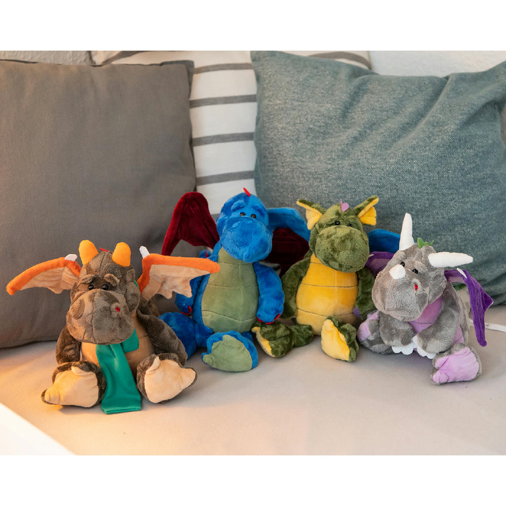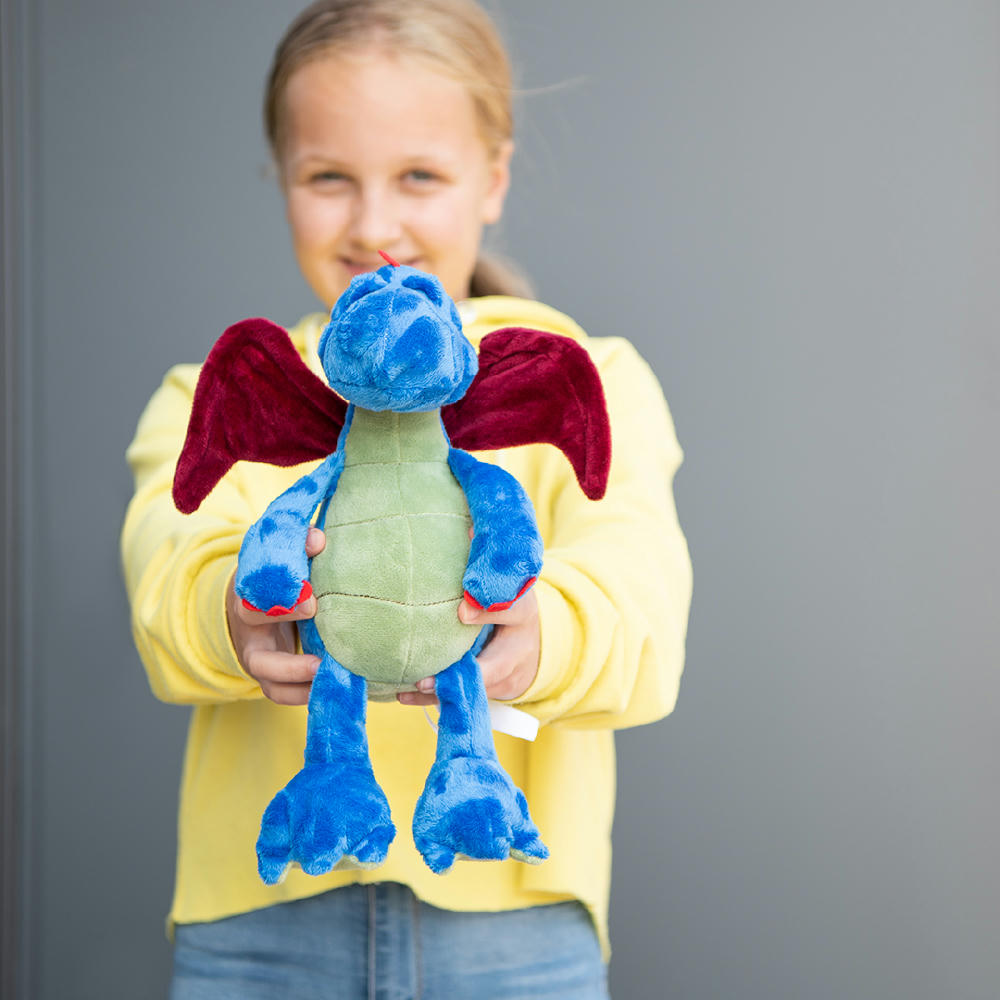 Drache Magnus ist der perfekte Drachenkumpel für kleine Helden: kuschelig-weich, giftig grün mit biegsamen blauen Schwingen.