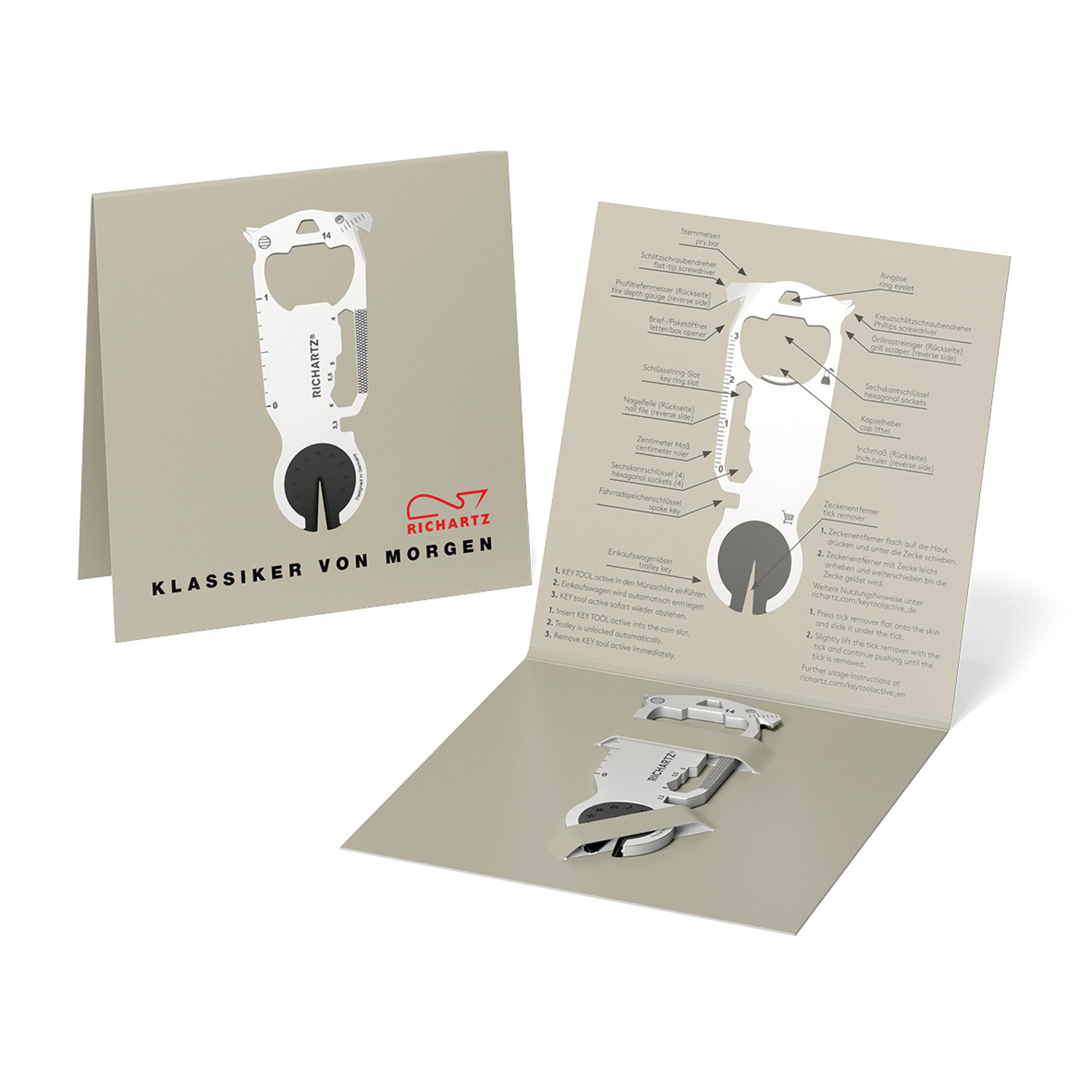 Das kleine, kompakte Multifunktionstool von RICHARTZ® mit dem nützlichen Zeckenentferner ist aus hochwertigem, matt gestrahltem Edelstahl gefertigt. Ein unentbehrlicher Begleiter, der an jeden Schlüsselbund passt! 20 Funktionen auf kleinstem Raum lassen kaum Wünsche offen.