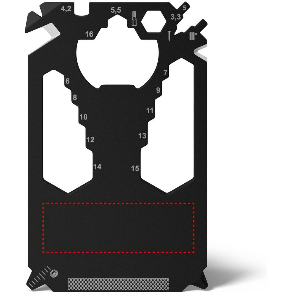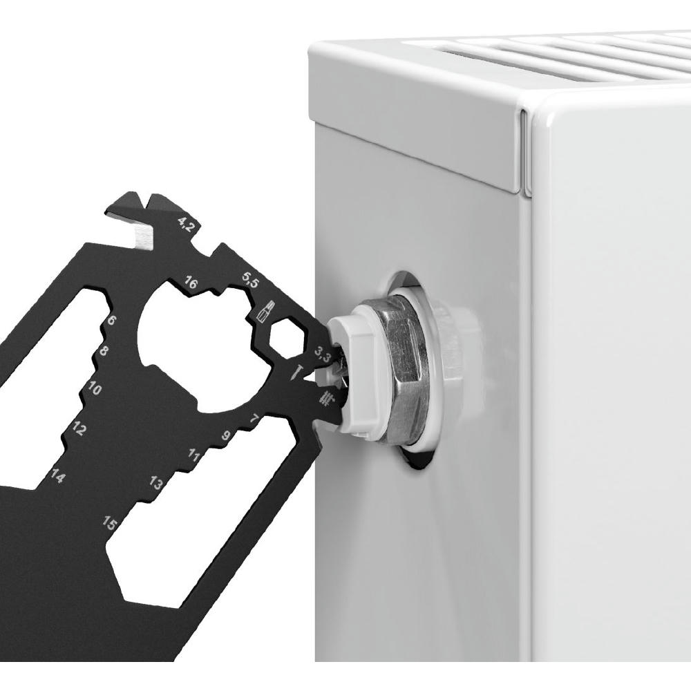 Scheckkartengroßes Multitool: Heizungsentlüftungsschlüssel, Speichenschlüssel (2), Nagelzieher, Bithalter, Stemmeisen, Brief- / Paketöffner, Kabelabisolierer, Sechskantschlüssel (12), Kapselheber, Zentimetermaß, Inchmaß, Kreuzschlitzschraubendreher, Nagelfeile, Winkelmesser, Schlitzschraubendreher, Profiltiefenmesser.