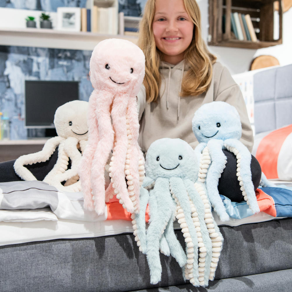 Studien haben gezeigt, dass Kuscheltiere in Form eines Oktopus ideal für den Start von Früh- und Neugeborenen sind, weil die Tentakel an die Nabelschnur erinnern. Liebevoll designt und entwickelt leisten die Recycel-Tieren außerdem einen wichtigen Beitrag zum Thema Nachhaltigkeit: Alle Recycle-Tiere bestehen aus genutzten und recycelten Plastikflaschen. Augen und Nase sind gestickt, es werden also keine zusätzlichen Plastikteile verwendet. Diese liebevoll gestalteten Schätze des Meeres aus zartem Plüsch eignen sich perfekt zum Schmusen, Kuscheln und Liebhaben. Versicherungen, Banken, Krankenhäuser, Kinderärzte und Kommunen können mit diesen Lieblingen im Willkommenspaket für den neuen Erdenbürger nicht nur ein Lächeln schenken, sondern auch Verbindungen fürs Leben schaffen. Eine Veredelung ist via Druck oder per eigenem Plott auf der angebrachten Werbefahne möglich und erinnert so stets an den Schenker.