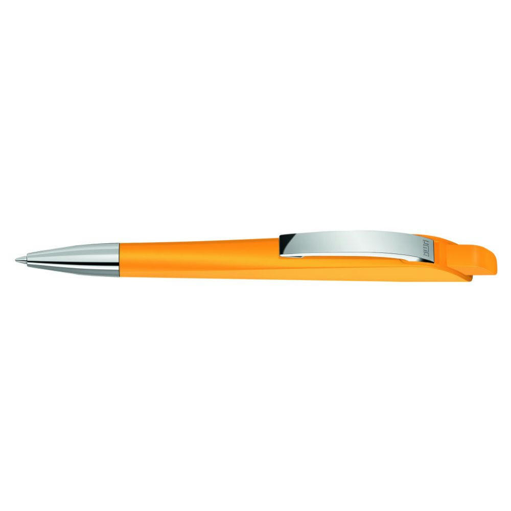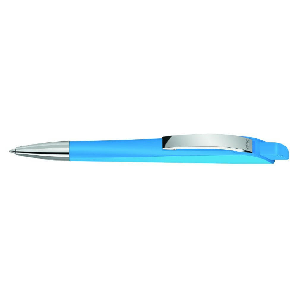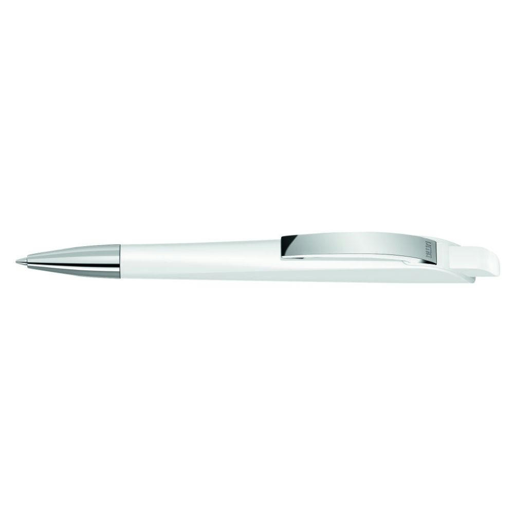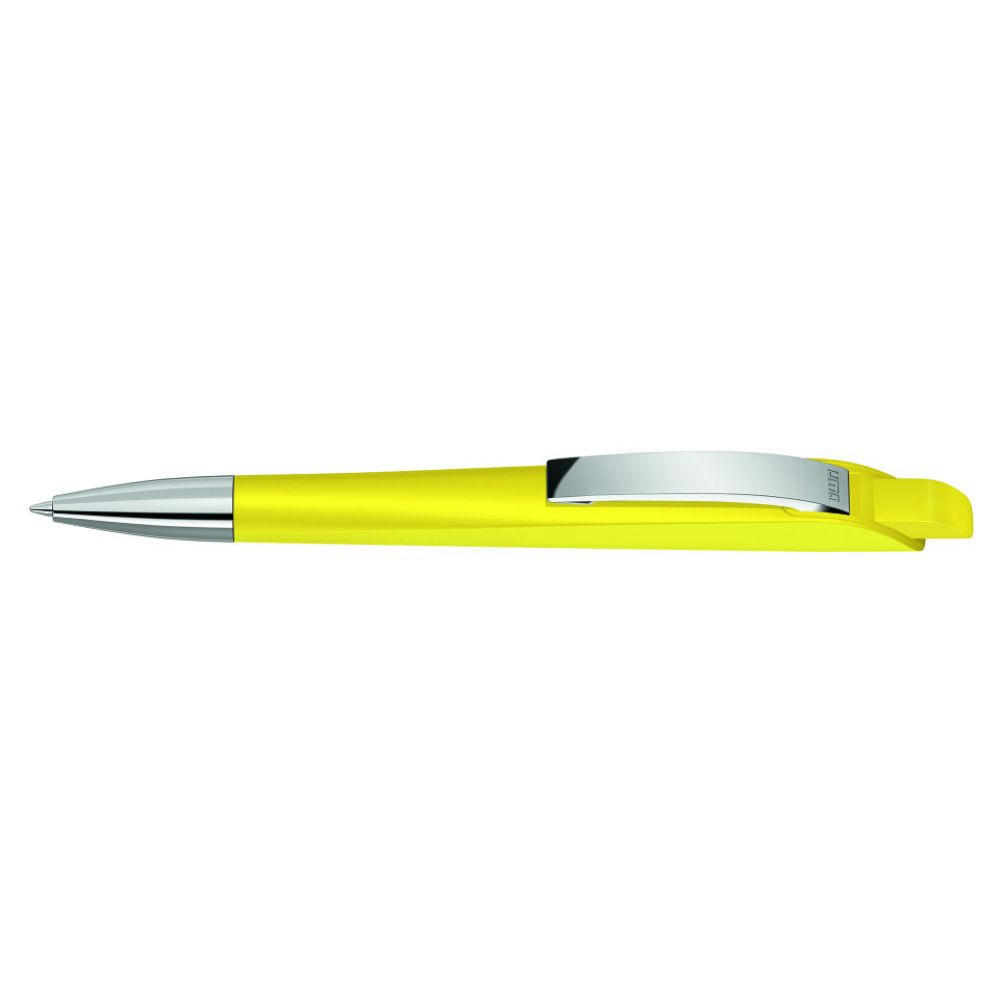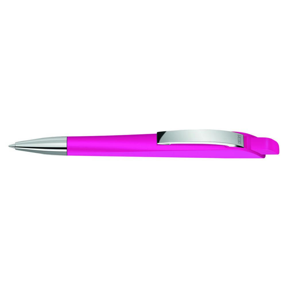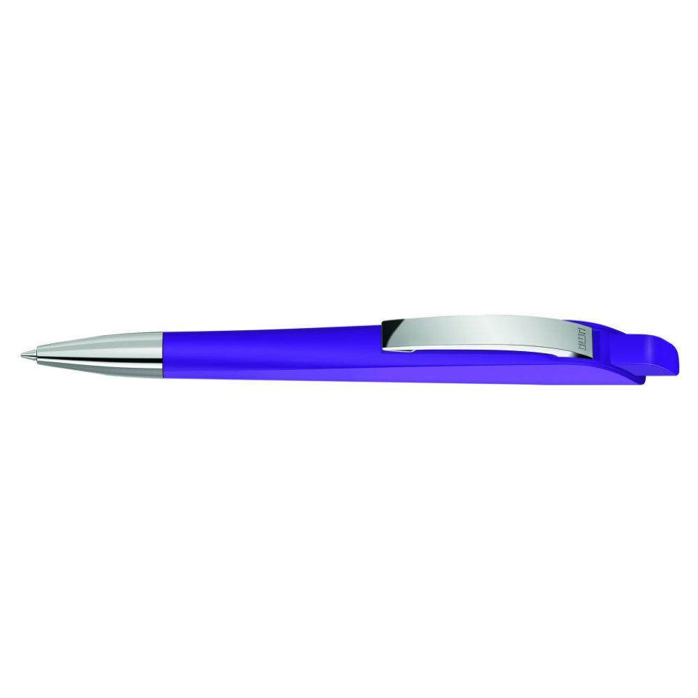 Druckkugelschreiber mit geometrisch wechselnder Schaftform. Gehäuse und Drücker gedeckt matt, Metallclip und Metallspitze glanzverchromt.