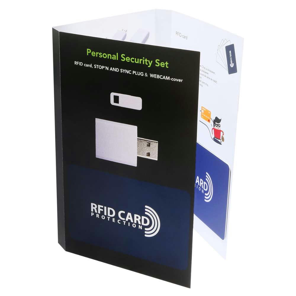 Maximaler Schutz für Ihre Daten bstehend aus Webcam Cover, Stop`n Sync Stecker und RFID Card auf einer Trägerkarte Standard oder optional individuell bedruckt. Schützen Sie sich vor Datenklau und Viren mit unserem RFID Security Set. Der einzigartige STOP`n Sync-Stecker verhindert den Datentransfer beim Aufladen von z.B. Smartphones am USB-port des Computers. Die Datenübertragung wird durch den Stecker deaktiviert. In Verbindung mit dem Handy Webcam Cover das Ihre Innenkamera am Handy vor unerlaubten Aufnahmen schützt.