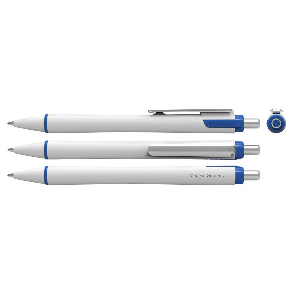 Druckkugelschreiber mit weißem *Gehäuse aus 70 % biobasiertem Kunststoff. Die Viscoglide®-Technologie sorgt für außergewöhnlich weiches und gleitendes Schreiben. Leicht konkav geformter Schaft und stabiler Metallclip. Zierring und Schaftverlängerung farblich abgesetzt. Ausgestattet mit Schneider-Mine 778 XB. Produkt mit finanziellem Klimabeitrag: Kompensation in Höhe der unvermeidbaren Emissionen in ein zertifiziertes Klimaschutzprojekt. Gehäuse: weiß/schwarz. Schreibfarbe: schwarz.
