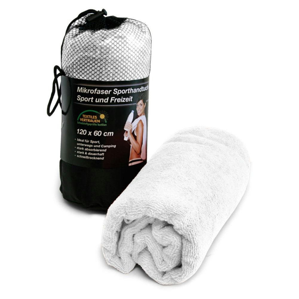 Mittelgroßes Sporthandtuch aus 85% Polyester und 15% Polyamid (Mikrofaser-Frottee 280 g/m²)stark absorbieren und schnell trocknend, in einem schwarzen Netzbeutel mit Infobanderole, die auf Wunsch selbst gestaltet werden kann.