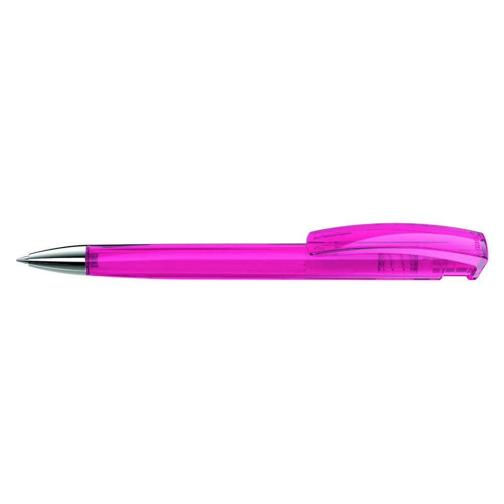 Druckkugelschreiber mit transparent glänzendem Dreikantgehäuse und schwerer Metallspitze glanzverchromt.